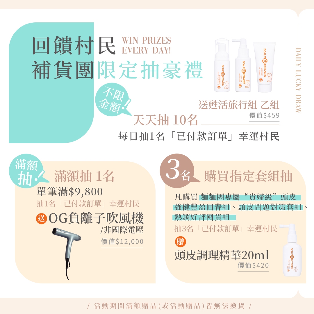 開團後只要到我的粉絲團開團動態下曬訂單留言就可以抽一組價值$2,640的髮基因冬季潤柔順髮組 乙組!