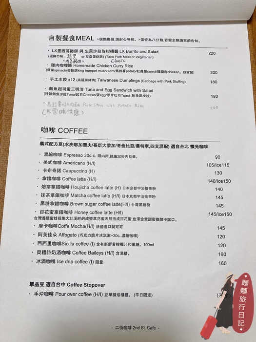 翻開菜單第一頁就看見咖啡廳自製的餐食,有水餃、咖哩飯、馬鈴薯燉肉飯;咖啡廳還有滿滿的咖啡選項!