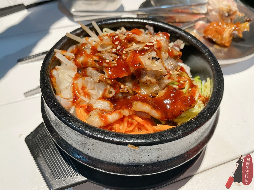 拌飯上蓋滿香噴噴的豬五花,下面還有3~4種的蔬菜,上面的韓式醬甜甜的,拌在一起滿好吃!缺點是份量不太多。