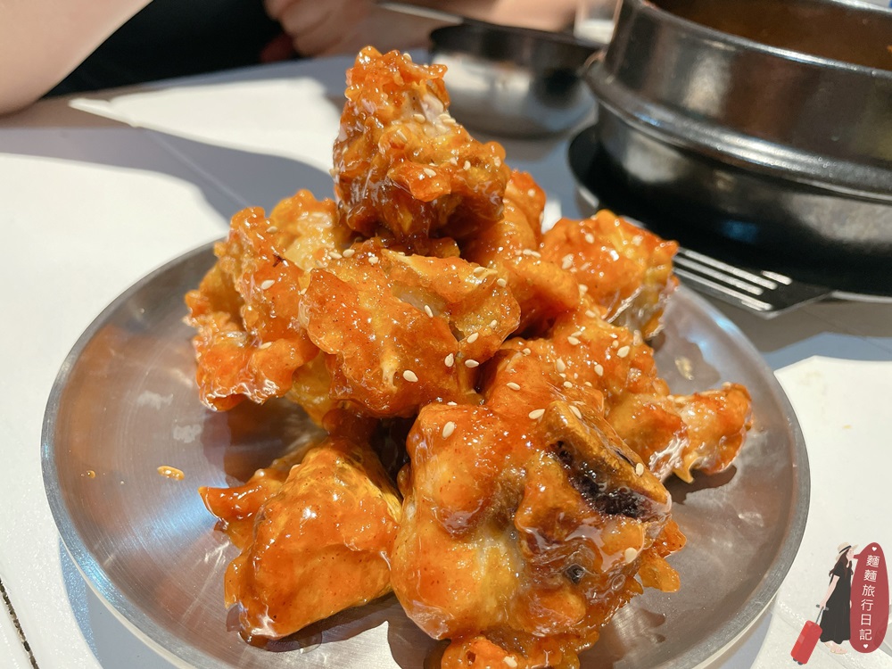 WULI NIGHT 韓國布帳馬車的炸雞有兩種辣的跟不辣的洋釀口味,因為帶波樂來所以村長點的是不辣微甜的洋釀口味哦~炸雞一份有7~8塊,不大份!熱熱吃很好吃,表皮炸得酥脆,表面沾上的醬汁是甜辣甜辣的,一口咬下還會噴汁,小朋友都很愛~