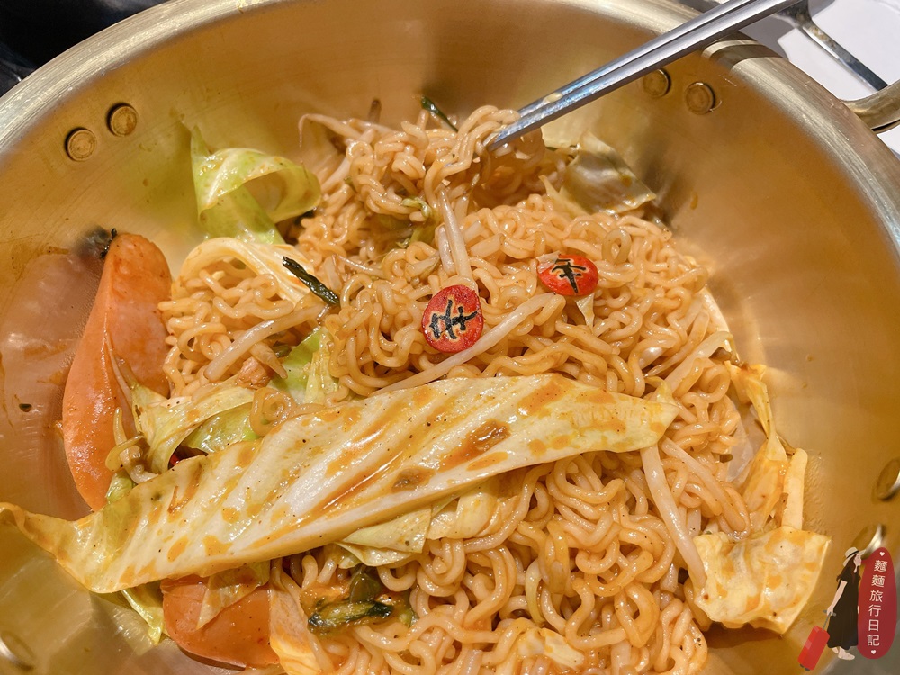 辛拉麵推出炒麵版,WULI NIGHT 韓國布帳馬車也有販售剛好點來吃吃看!炒泡麵有加蔬菜、熱狗一起炒,炒麵款有辛的可愛魚板!