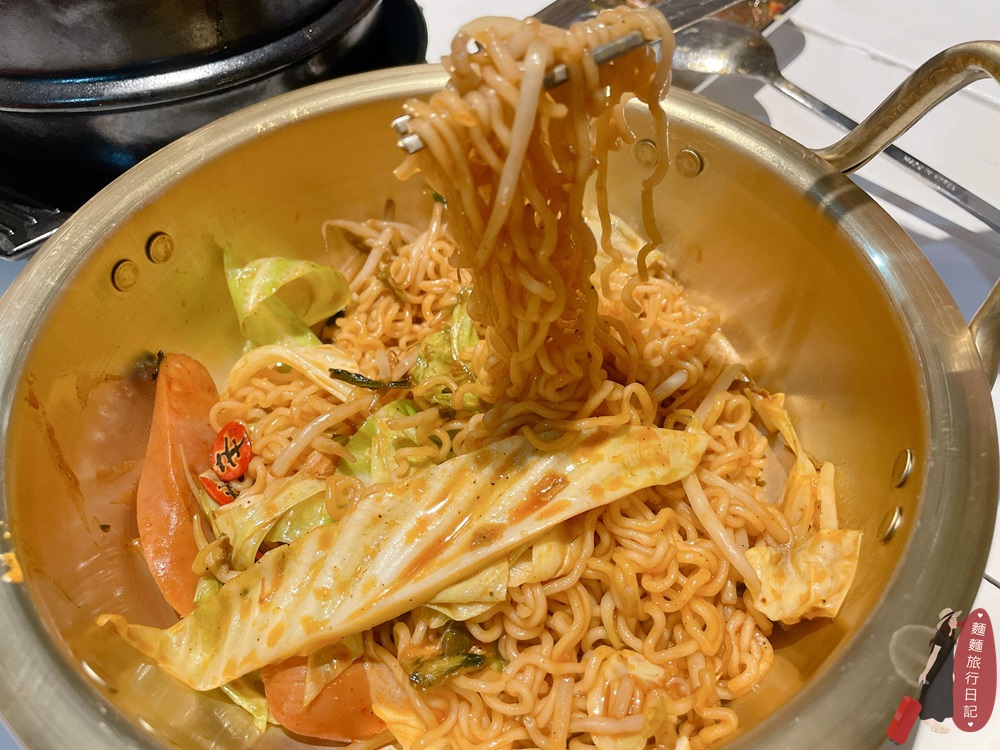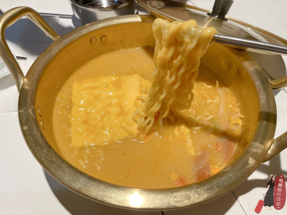 拉麵都用韓國金鍋煮,用這金鍋吃更有味道了!起司拉麵裡有蔬菜、火腿,煮好的拉麵上還放了起司!就是高熱量好吃碳水的味道啊!忍不住一口接一口~