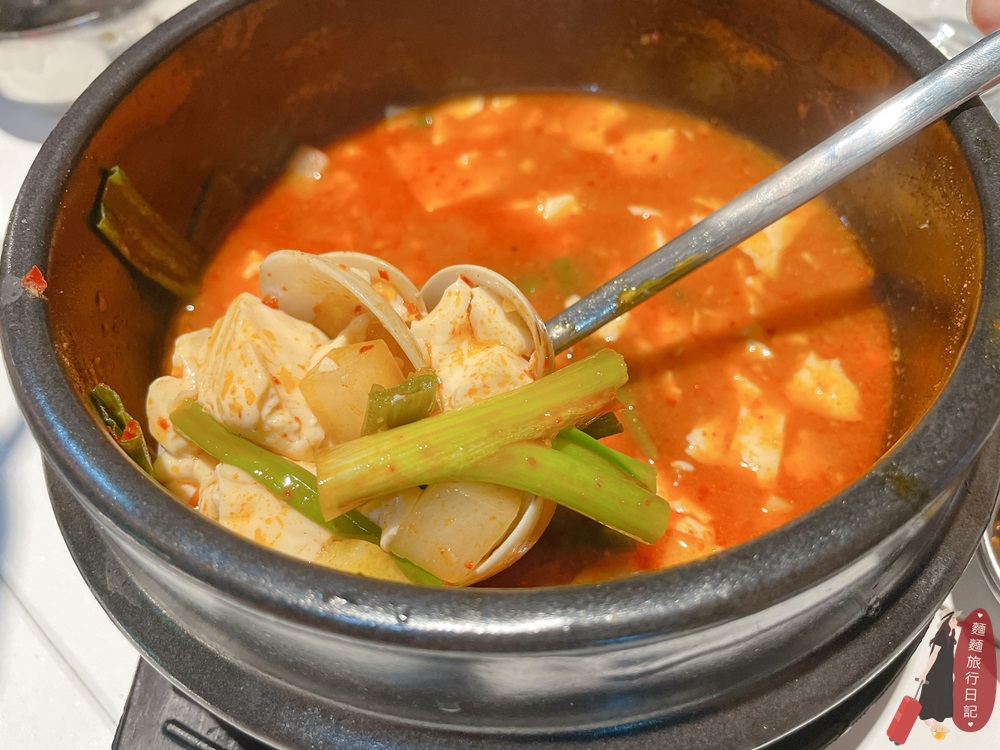 海鮮豆腐鍋裏頭的配料非常簡單,滿滿的豆腐,還有簡單的蔬菜跟海鮮蛤蠣!湯頭味道很濃郁,豆腐很嫩,湯又夠燙,我覺得很不錯!