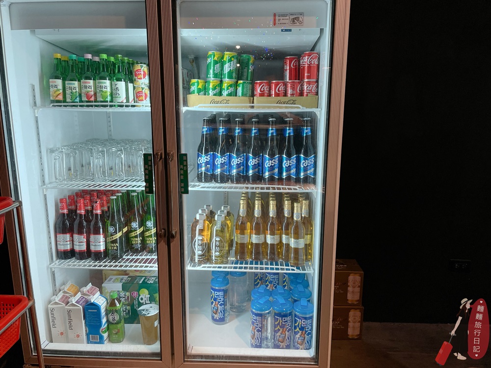冰箱裡滿滿的酒跟飲料,還有很多不同口味的韓國真露燒酒。