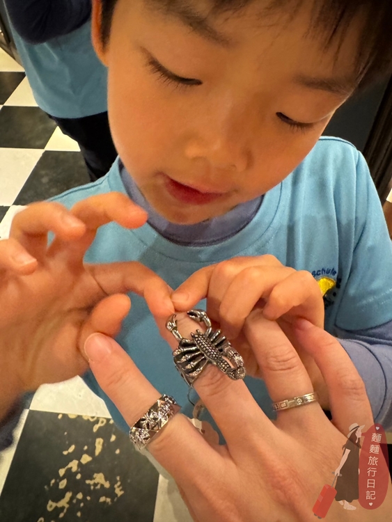 我的手完全被當成手模,樂樂一直往我手上戴各種不同的戒指。