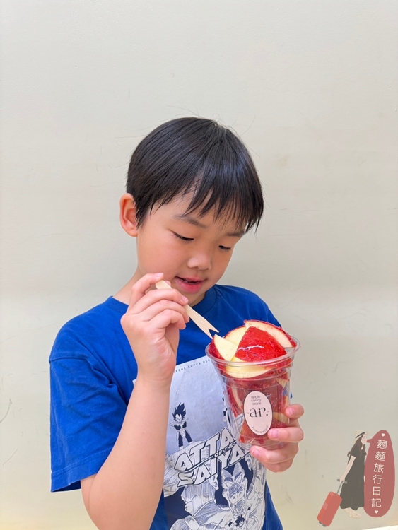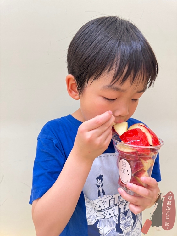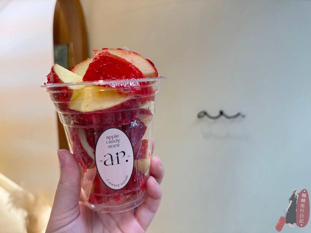 りんご飴専門店 AR.的蘋果是有特別挑選過吃起來香脆、酸甜適中的,選好口味後店家會幫你切成好入口的大小裝到杯子裡。