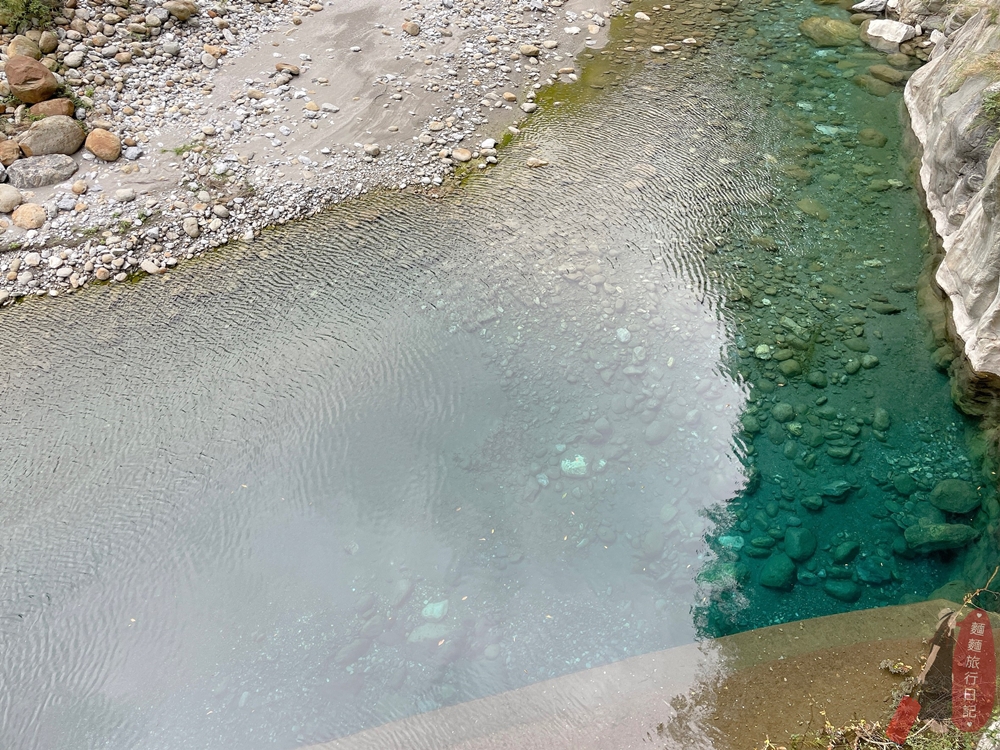 峽谷溪水真的超級碧綠,美死!然後小屁還又問,水很深嗎?裡面有魚嗎?走個步道容易嗎我😂