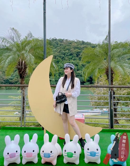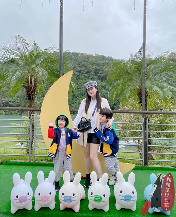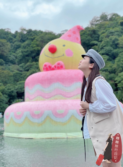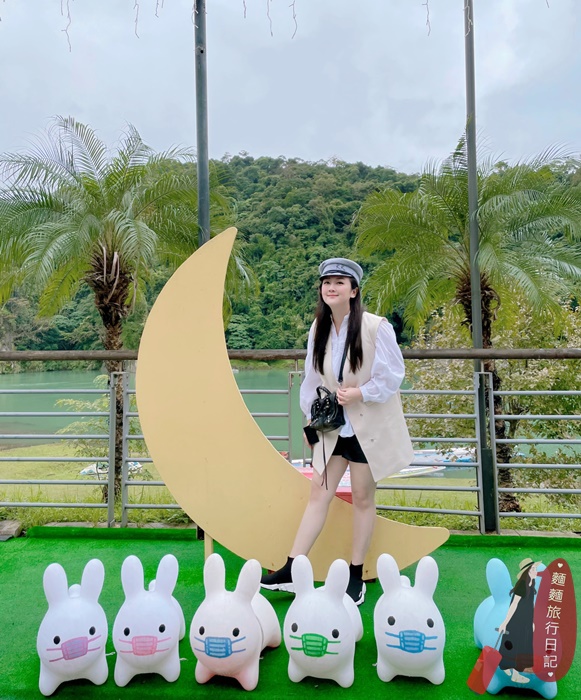超級巨大的月亮蛋糕就浮在碧潭上,兩側搭配可愛的小熊和兔子。