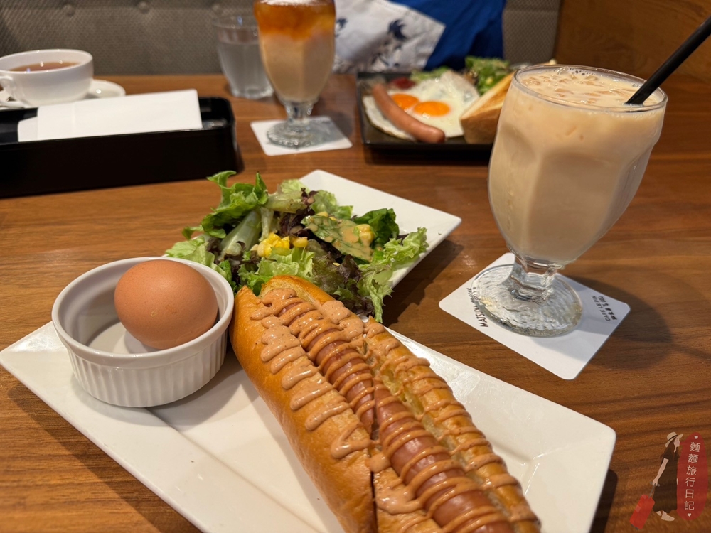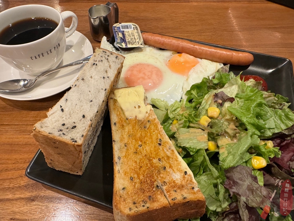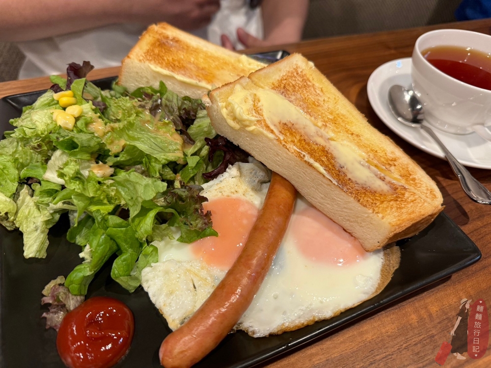然後早餐都是以吐司、三明治為主, 點一杯咖啡都可以搭配早餐,早餐套餐是吐司搭配荷包蛋、香腸及生菜沙拉。