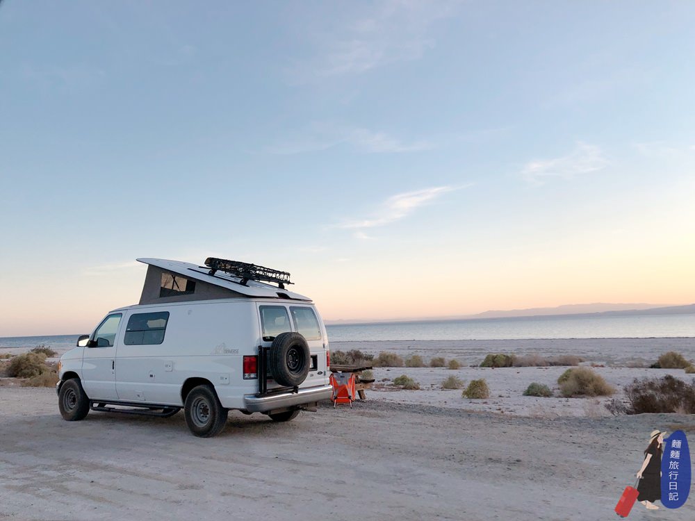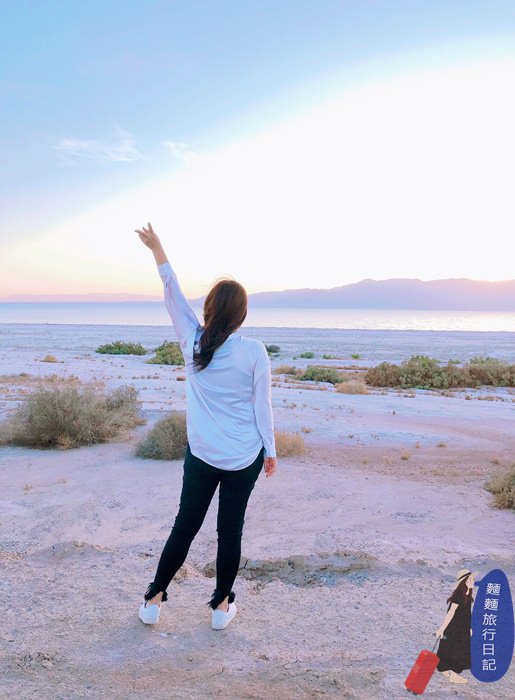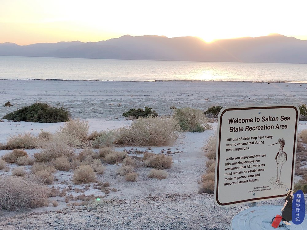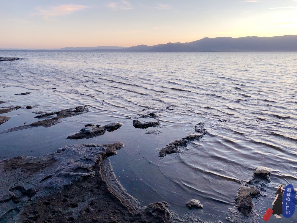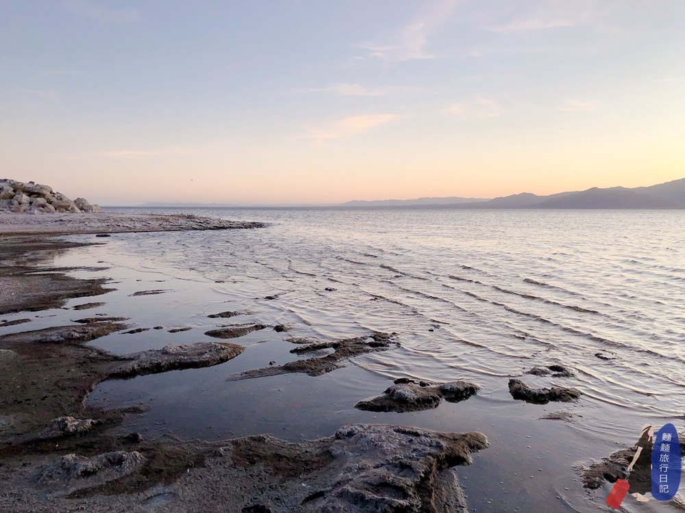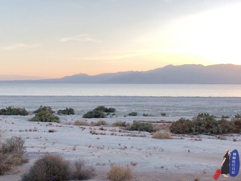 然而好景不常,現在的索爾頓湖一片荒涼,我們在傍晚的時分來到這裡剛好可以欣賞夕陽,夕陽把湖水映得粉橘,搭配著遠方的山景,看起來真的有種夢境的感覺。