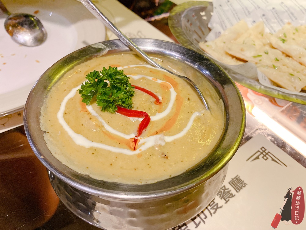 印式雞肉湯,喝起來是濃濃蒜味的雞肉玉米濃湯。
