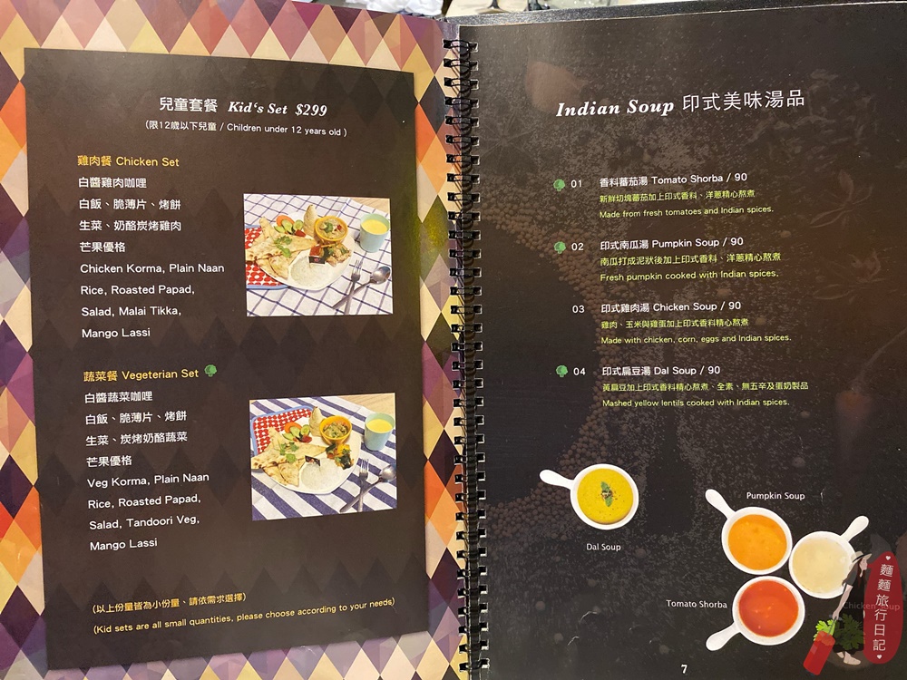 居然有推出兒童套餐欸!帶小朋友的可以參考喔~右邊開始就是單點囉!從湯品開始,啊 印度料理還有很多鷹嘴豆、扁豆,你們看有扁豆湯欸!