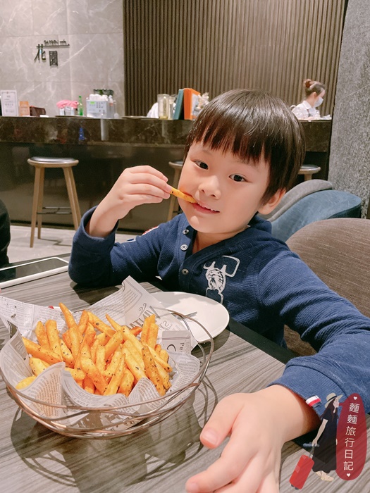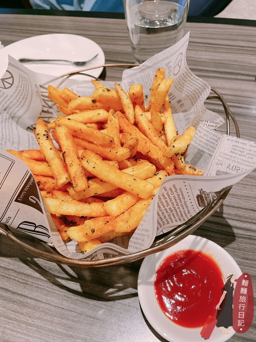 因為村長沒有做功課,不知道想吃牛肉麵有分時段,要午餐或晚餐時段去才吃的到啦!我們是下午茶時段去的🤣哈哈,所以餐廳提供的是下午茶菜單!點了一堆有的沒的,這是松露薯條。