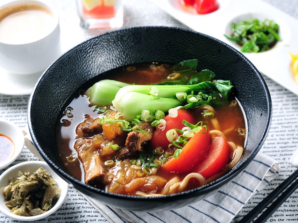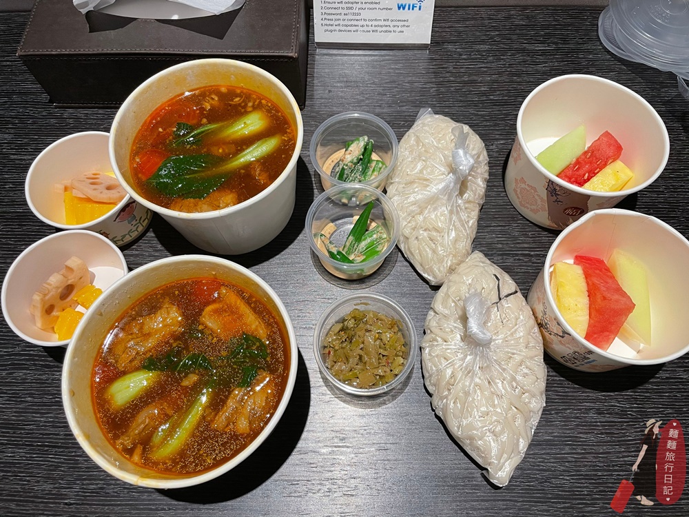 還好餐廳服務超棒!應該是看出我們一家人殷殷期盼想吃牛肉麵的小眼神,幫我們做了外帶,我們吃完一波下午茶後,牛肉麵是外帶回房間吃,除了牛肉麵本身外,還有附配菜、酸菜跟飯後水果!