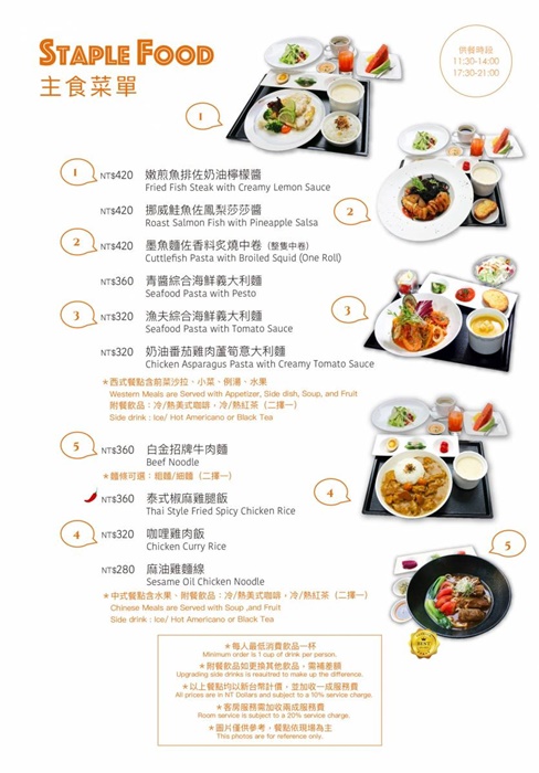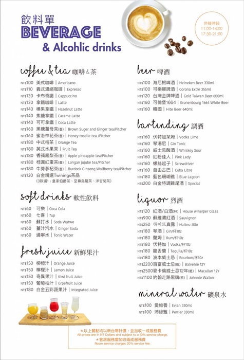 花園咖啡廳提供了中式、西式、下午茶、飲料等餐點!雖是全天供應,但下午茶菜單跟午餐、晚餐的餐點是不同的。