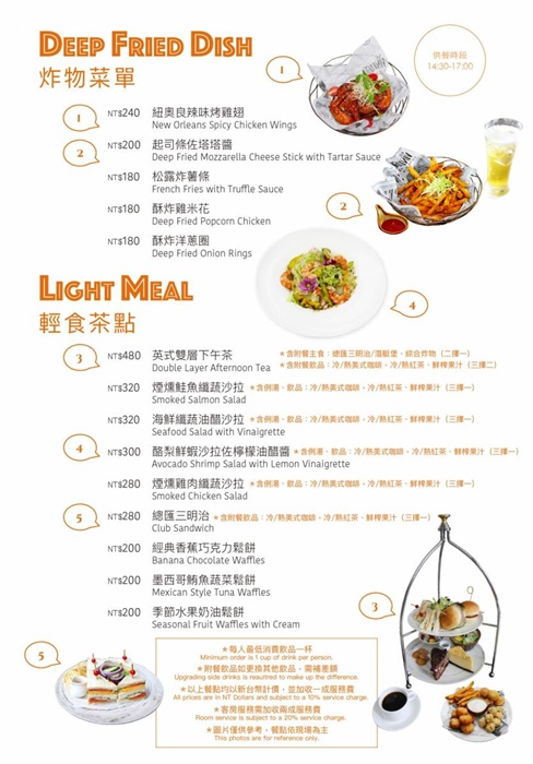 下午茶時段的輕食、甜點菜單,下午茶的供應時段是14:30~17:00。