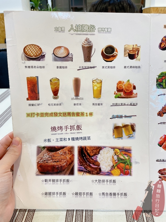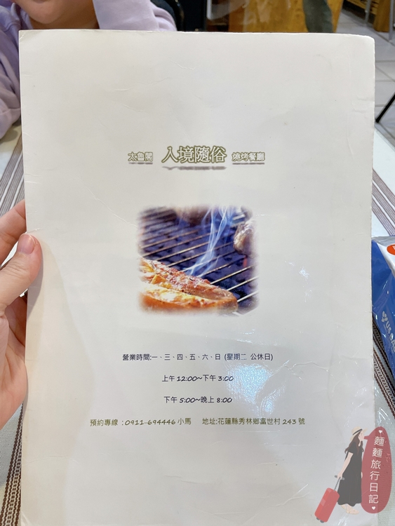太魯閣入境隨俗原住民燒烤手抓飯餐廳提供傳統的原住民料理,老闆娘用記憶中媽媽的味道、與原住民的烤肉飲食,使用傳統煙燻法烹飪當季食材,菜單很簡單有飲料、燒烤手抓飯。