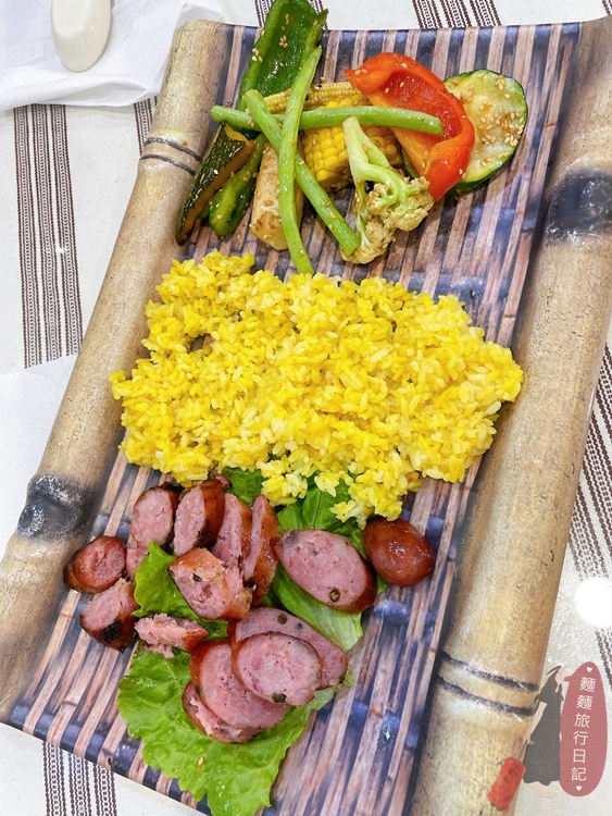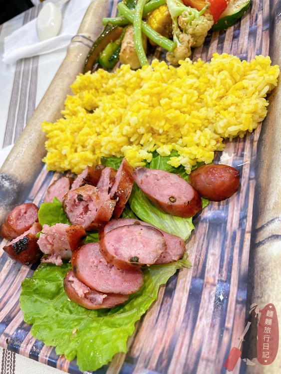 馬告香腸香氣非常好,簡單烤過就很好吃呀!紅色香腸、搭配薑黃飯,還有旁邊五顏六色的烤食蔬,顏色超好看!看起來是不是超美味!