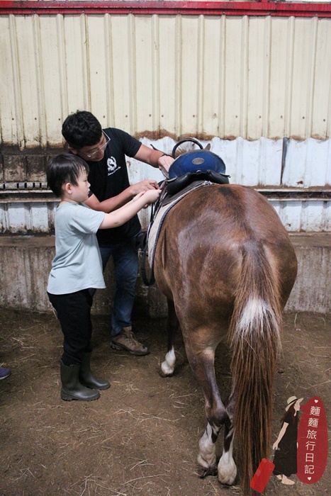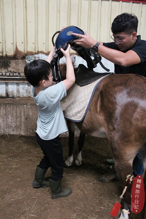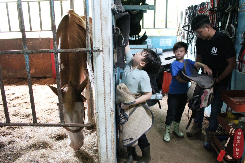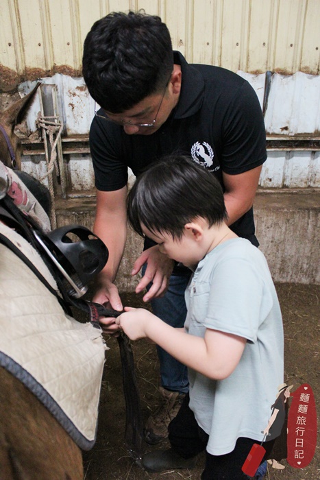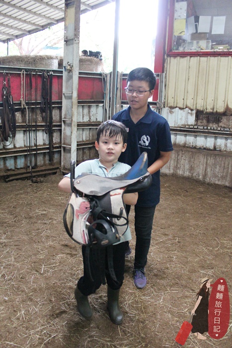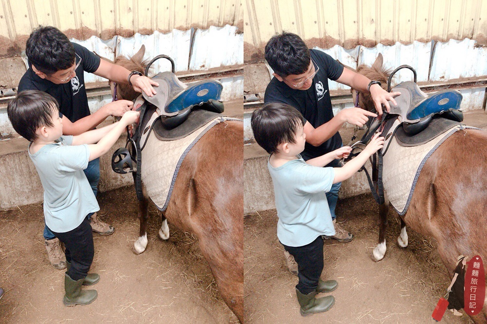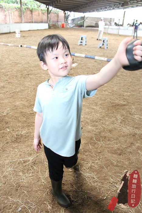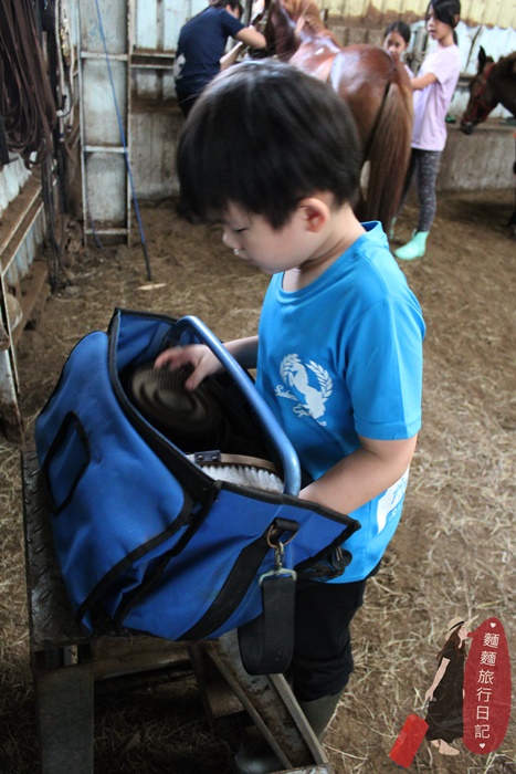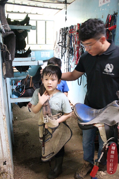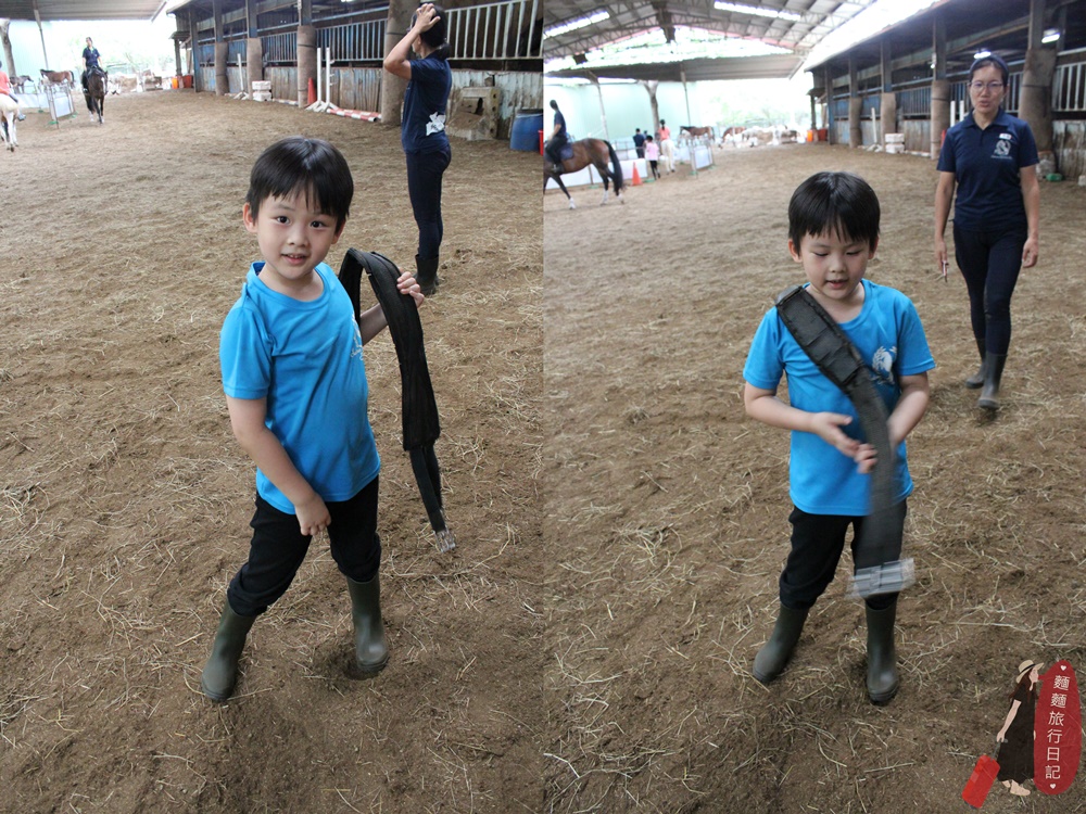 剛開始波仔還不知道拿什麼裝備,常常把裝備搬到馬場後被教練打槍,不是這個喔~來~再去拿😅😅😅,多錯個幾次很快就學會了。