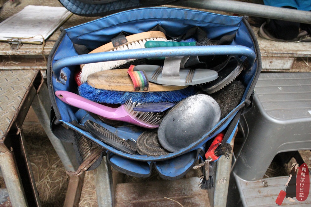 聽完課後就是實際操作,每組回到自己的馬兒旁,聽教練指示去拿裝備。
