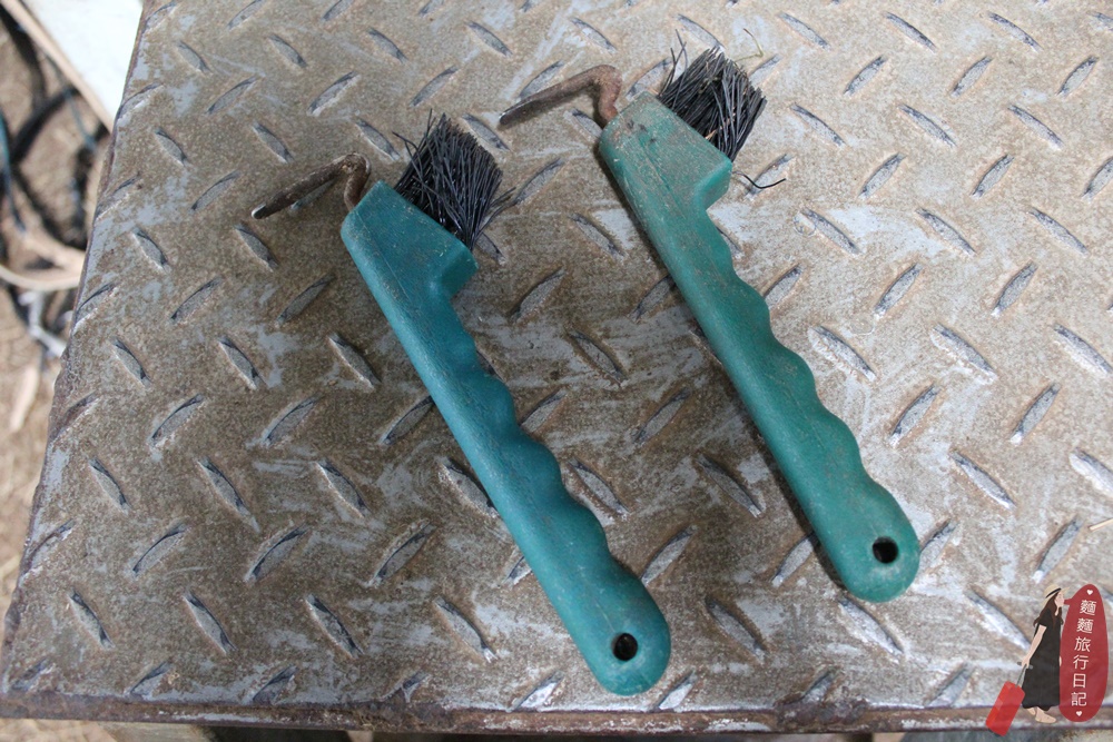 清馬蹄的工具蹄簽,工具都是波仔自己到工具箱裡拿的,清完後再自己放回原位。我滿欣賞這個馬場的教練跟他們的教學態度,他們都會訓練孩子們從頭到尾負責任,並不是當公主少爺有人幫你準備好來了只要騎馬就好喔!