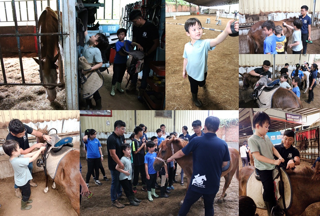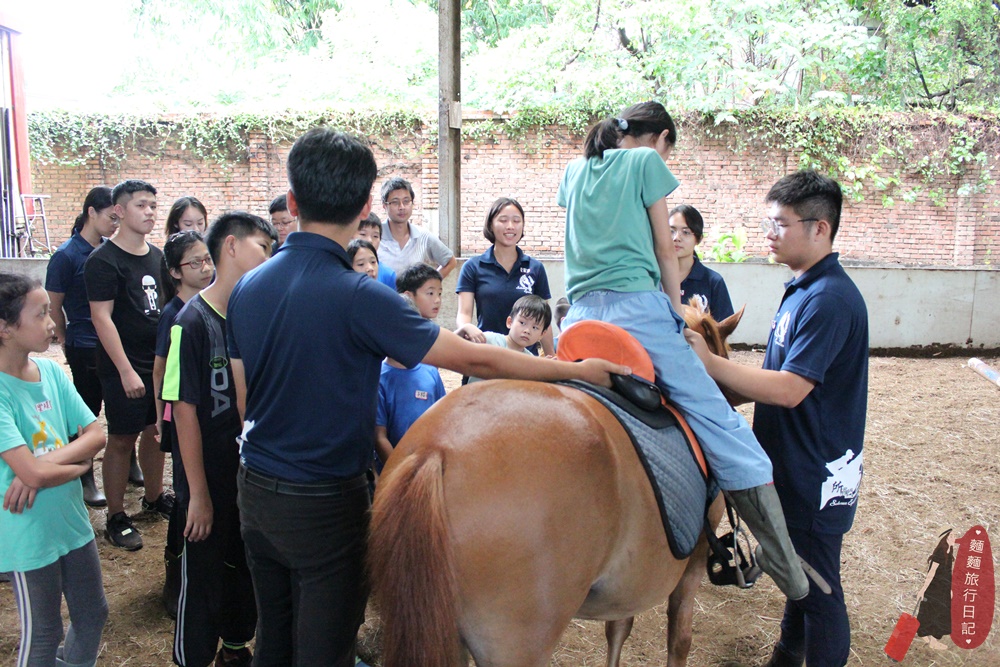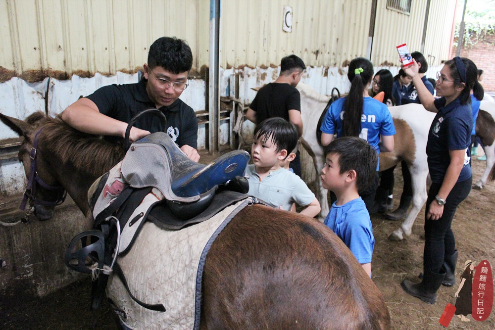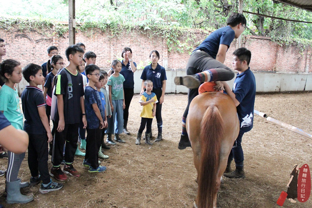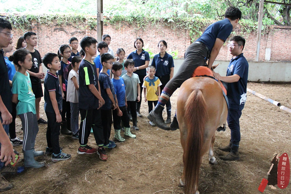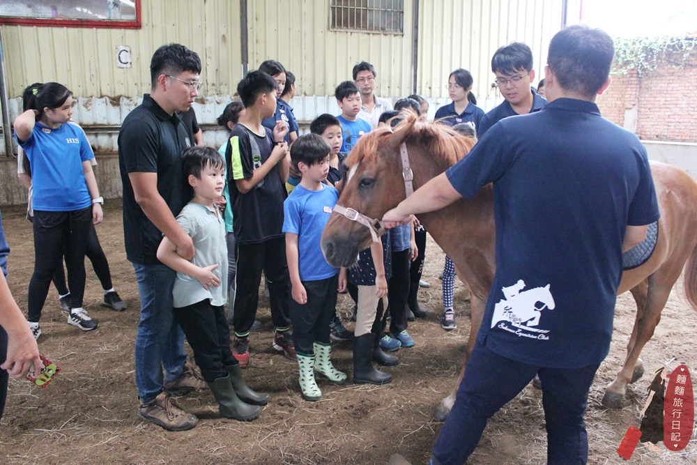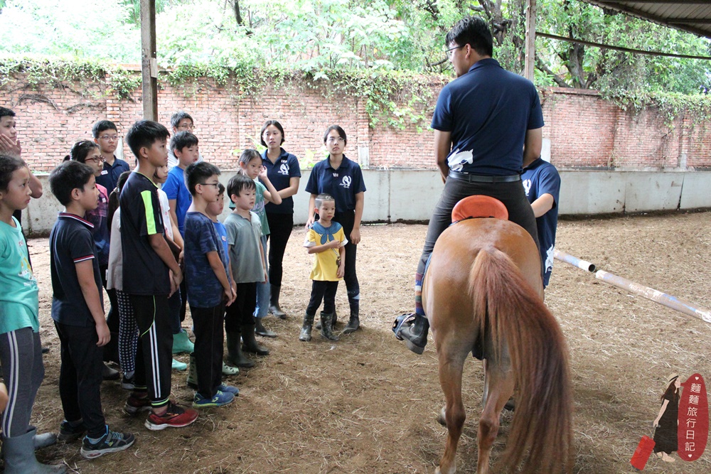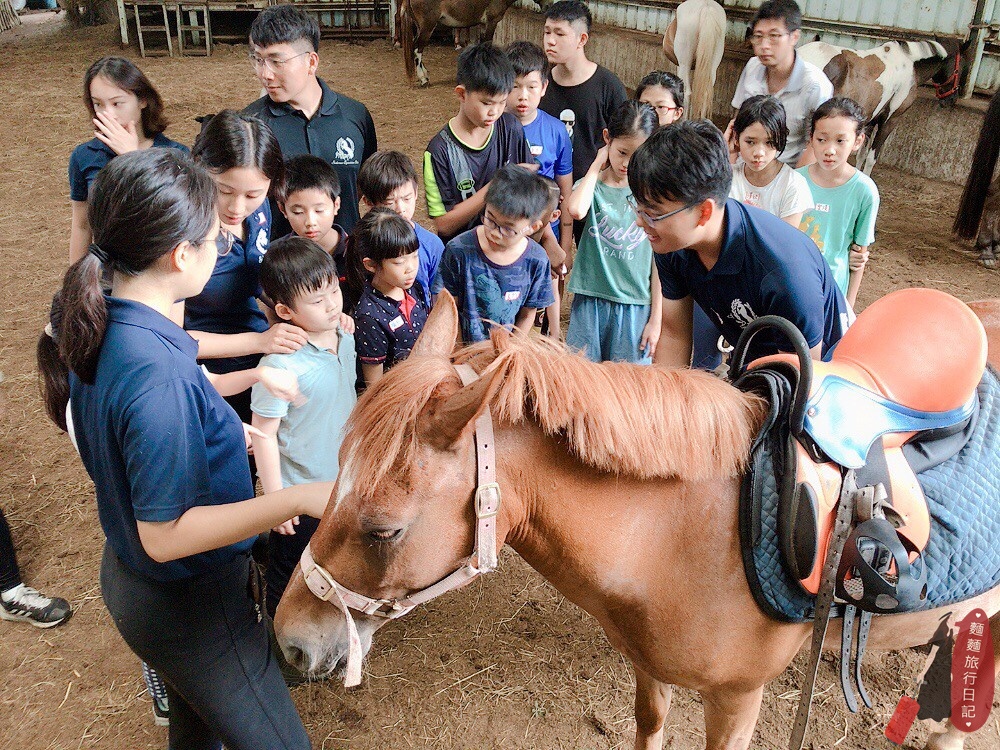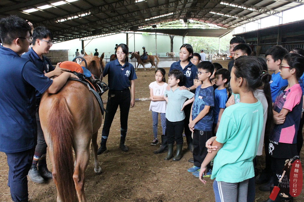 第一天除了與馬親近、互動外,還教大家如何上馬鞍等裝備,教練會聚集所有參加夏令營的小孩,然後示範一次給大家看。