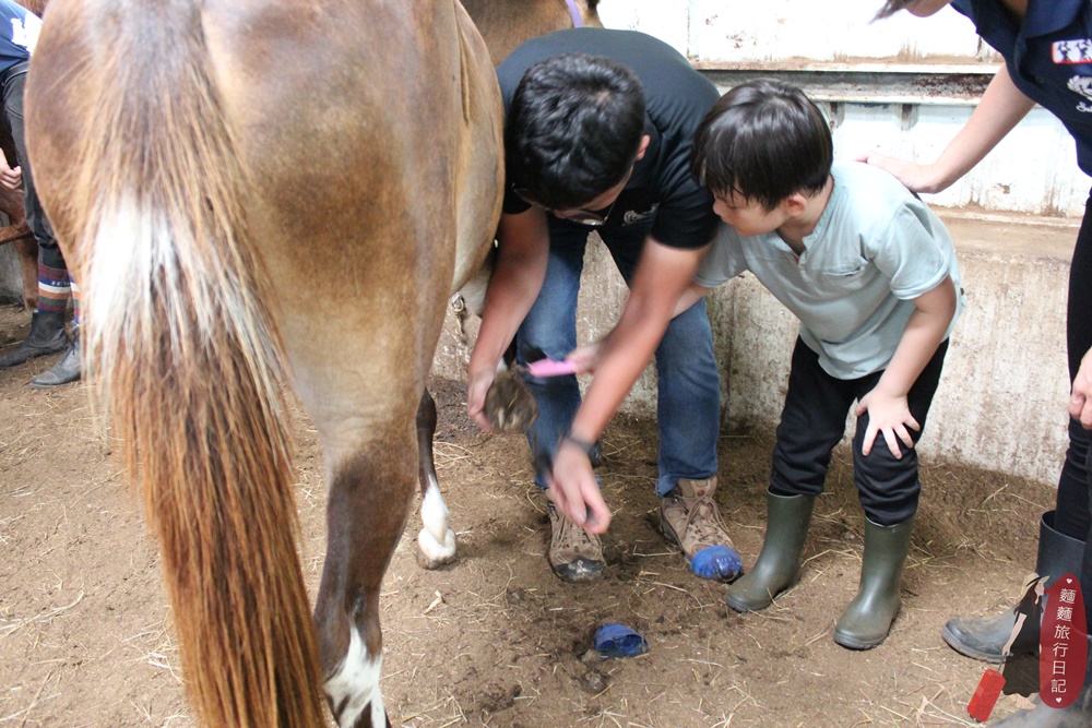 刷好毛接下來要幫馬清理馬蹄裡的泥土、污垢和石塊,這樣等一下馬走路的時候才不會不舒服。