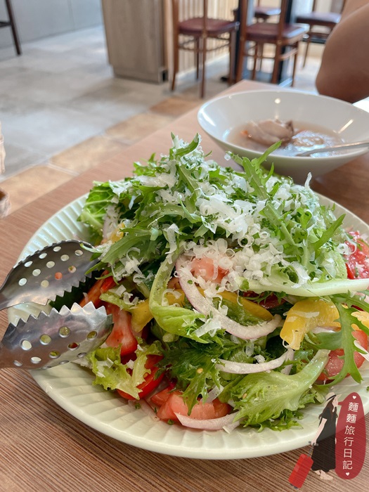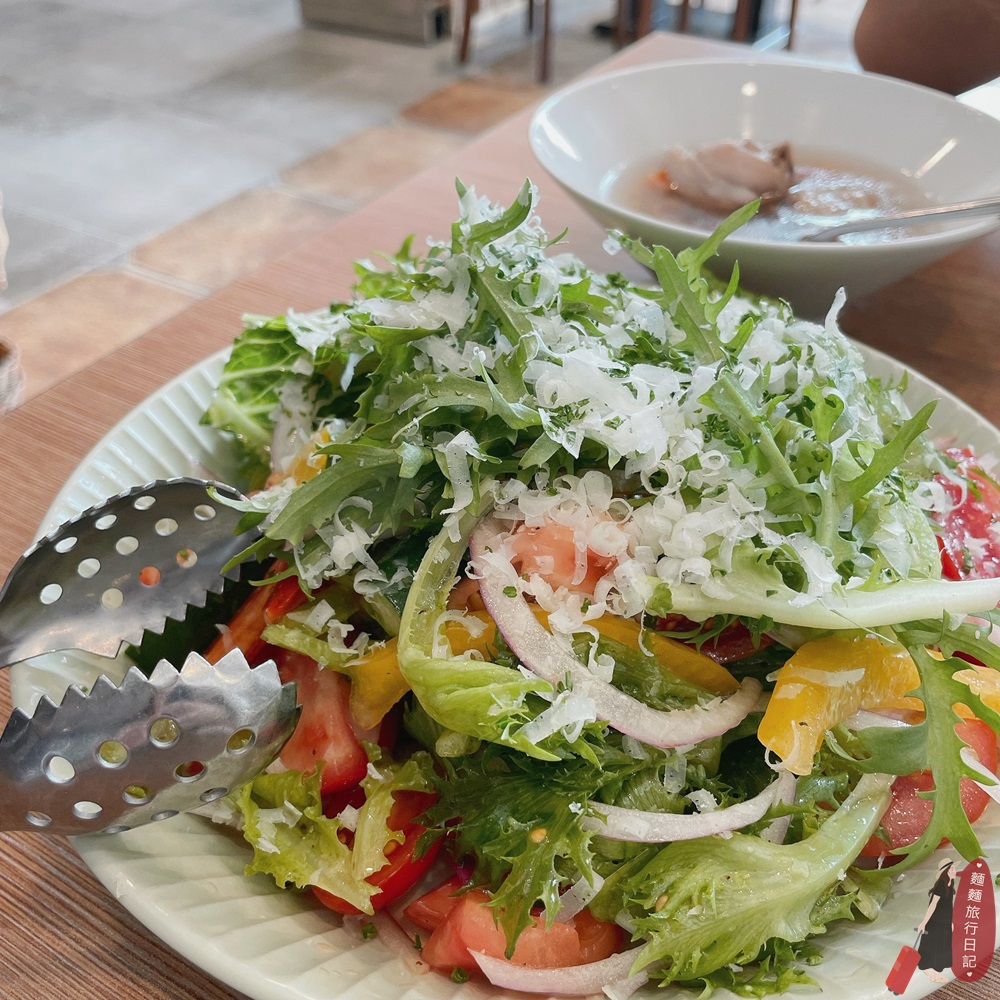 點了Green沙拉一整個滿滿的都是不同種新鮮蔬菜堆疊成一座小山,上面刨了起司好像雪花一樣,搭配醬汁一起拌著吃,好吃開胃!