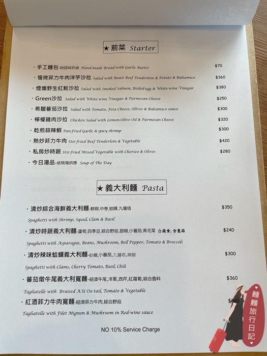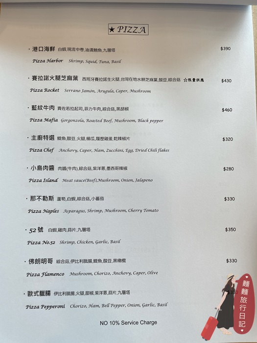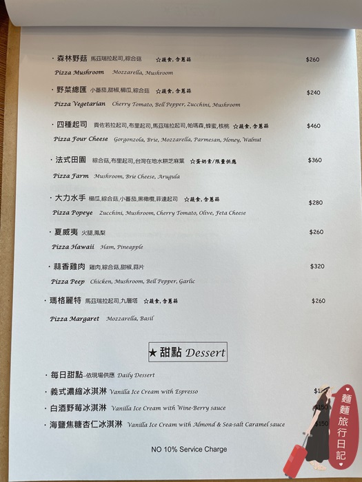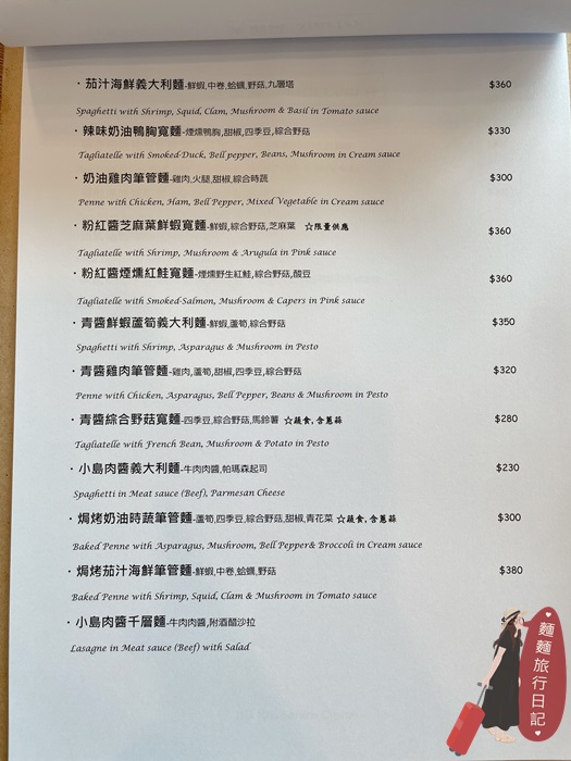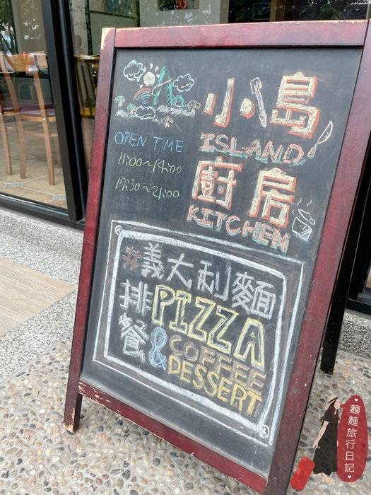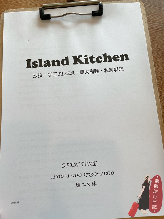 小島廚房周二公休,餐點提供開胃前菜、義大利麵、排餐、手工Pizza 等,菜單如下圖。