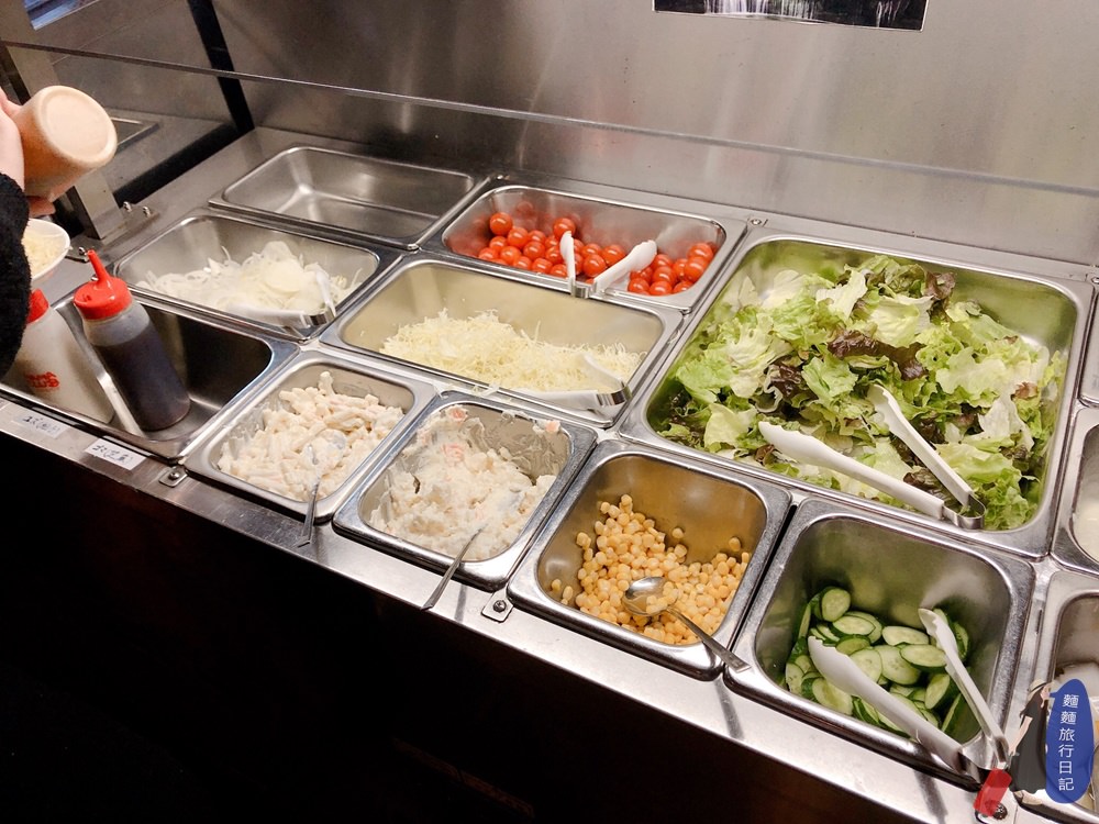 廚房是半開放式的,廚房前面有一區自助式的生菜沙拉區,生菜水果都很新鮮、還有馬鈴薯沙拉跟通心粉沙拉。