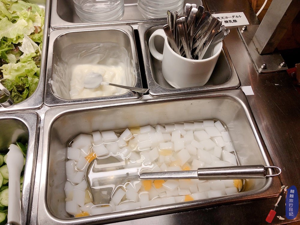 生菜沙拉有提供優格醬、還有杏仁豆腐,沙拉吧旁邊是玻璃冰箱櫃,冰了很多啤酒、飲料。