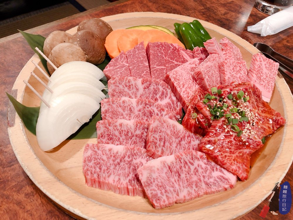 我點了一份和牛套餐,加2位的沙拉吧,1人¥350 日幣,肉的油花分布超美滴,而且分量滿大的,很多種肉欸!裡面有菲力、排骨牛、五花牛跟一些蔬菜,套餐裡的和牛,牛肉都有一定的厚度,我一開始還想說這麼便宜可能肉品質不是很好,沒想到這肉很可以啊!
