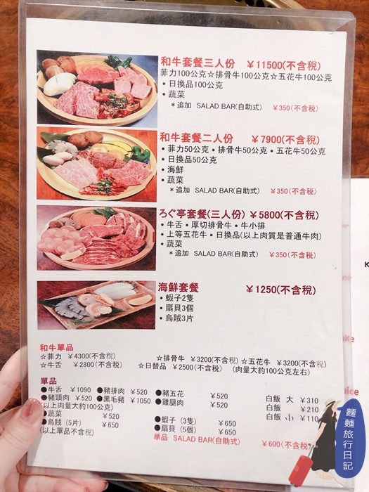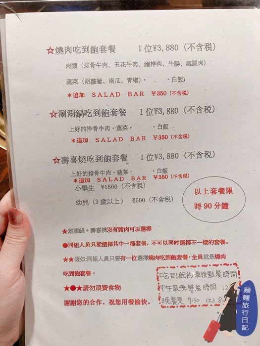 我們坐在四人座位區,ろぐ亭餐廳有收住宿打工的學生、台灣人,所以幸運的話會遇到會說中文的服務生,格外的親切,如果沒有的話,餐廳也有提供中文菜單,超級清楚!有燒肉、刷刷鍋跟壽喜燒這三種吃到飽可以選擇,我們選的是燒肉吃到飽!價錢超級經濟實惠耶~