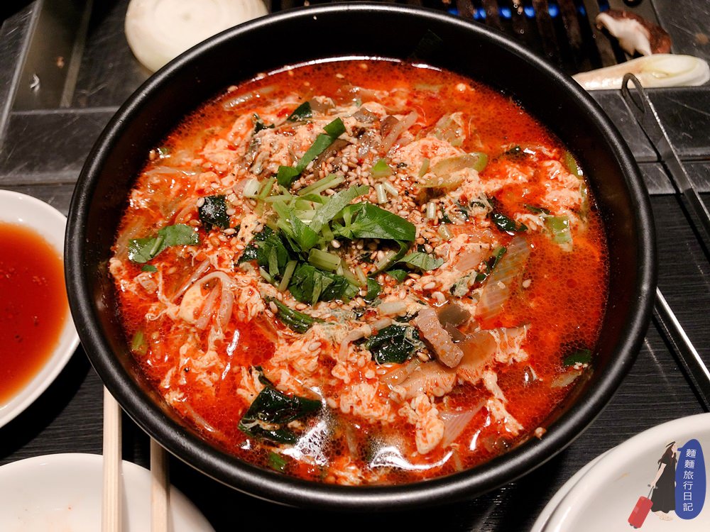 剛剛那是兒童版,現在這是村長最愛的辣牛肉湯,這辣牛湯熱呼呼的上桌,吃一口燒肉再喝一口超燙超辣的湯,簡直過癮!從喉嚨燒到胃~冬天想吃燒肉又想點個熱鍋吃,真的好棒~