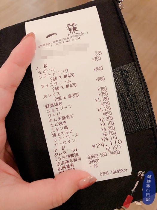 一龍嚴選最頂級牛肉,所使用的牛肉為最頂級A5等級的黑毛和牛,提供頂級牛五花或里肌等,除此之外還有正統的韓國料理可以點,很好吃,誤打誤撞的又吃到一家高級好吃的燒肉店,偷偷說我覺得這樣的價錢可以吃到A5和牛,比我們在東京叙叙苑還要划算很多,回台灣收到帳單一龍燒肉是6,674台幣,前幾天吃叙叙苑超貴是台幣9,211元兩間選一間吃的話,一龍燒肉絕對大勝!推推推~必收藏輕井澤燒肉!