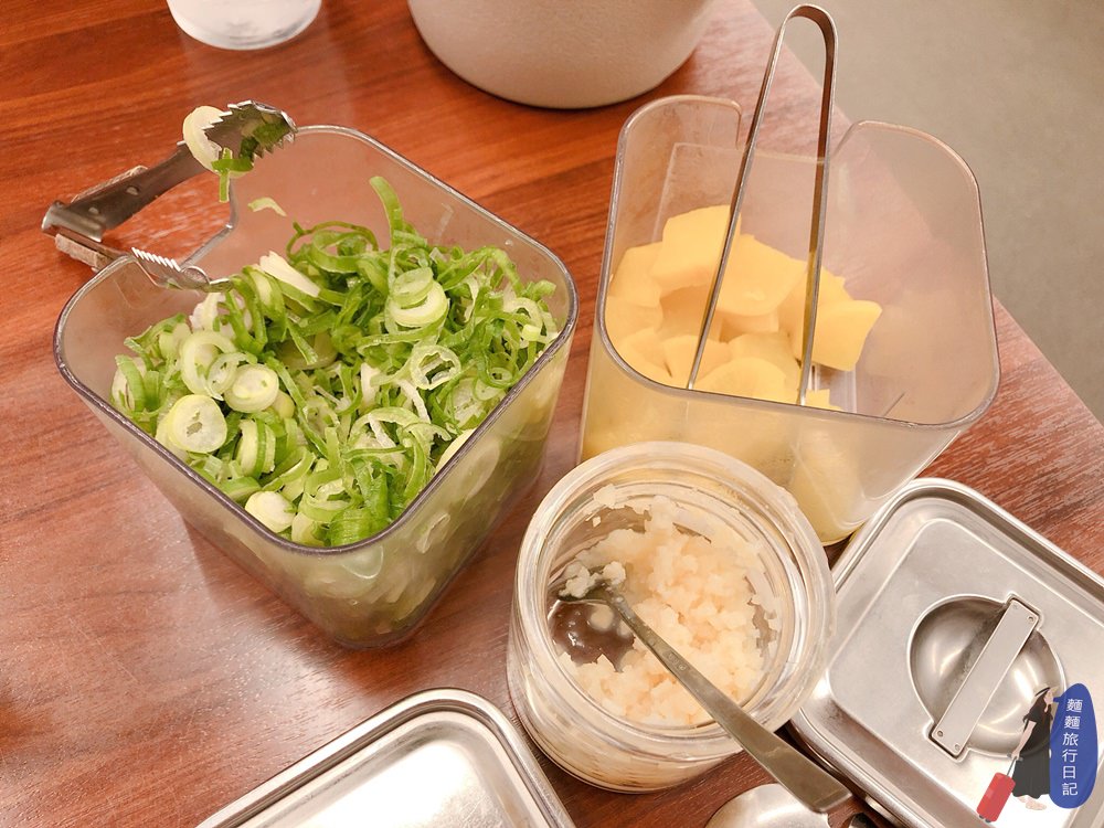 桌面上放蔥花、醃蘿蔔跟大蒜,大家可以依個人口味加進拉麵裡。
