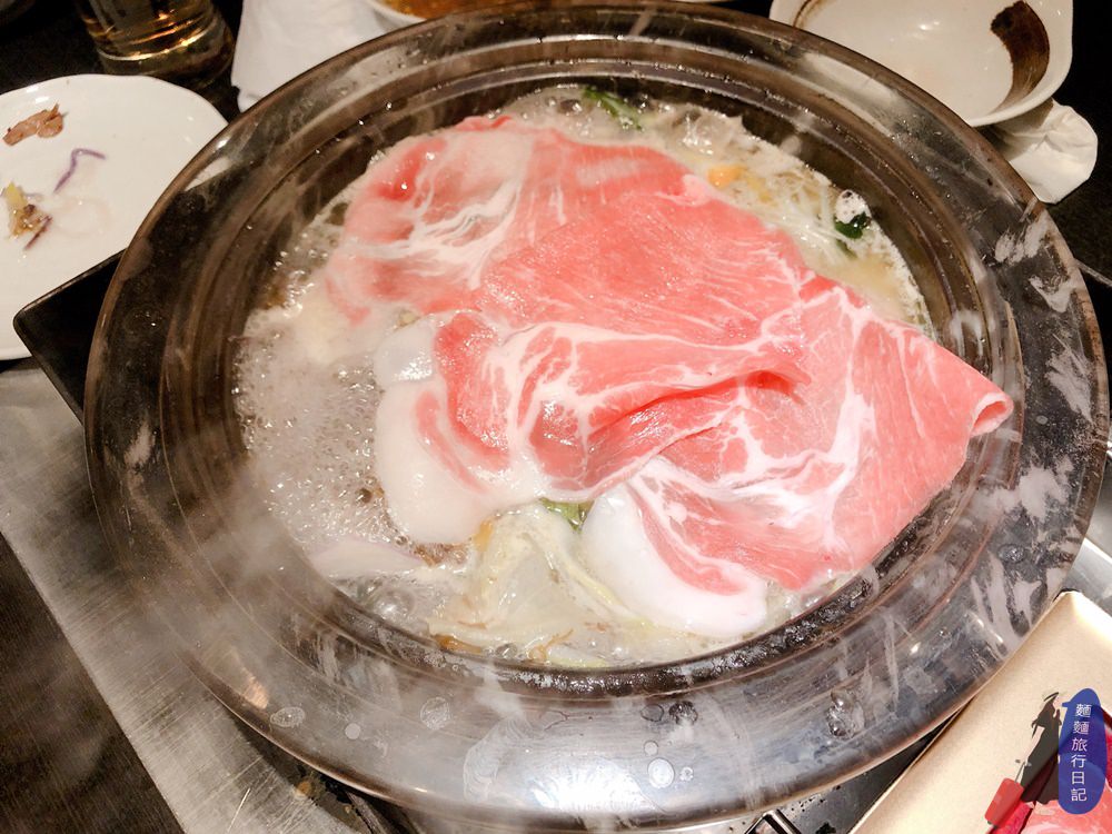 黑毛豬又有夢幻豬肉之稱,看看這油花分布的這麼美麗的粉紅色肉肉被我丟下鍋煮,看起來就很好吃啊!阿古豬本身就夠好吃了,用水晶鍋煮的話,會更上一層樓的好吃!因為水晶鍋有高度的保溫性質,可以慢慢加熱肉片並消除肉片原有的腥味,除去多餘的脂肪並將鮮美的肉味鎖在柔軟的肉片裡,,太犯規啦~~~