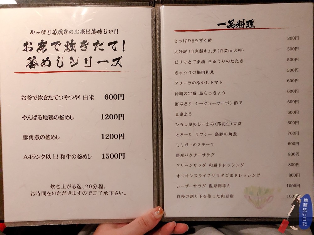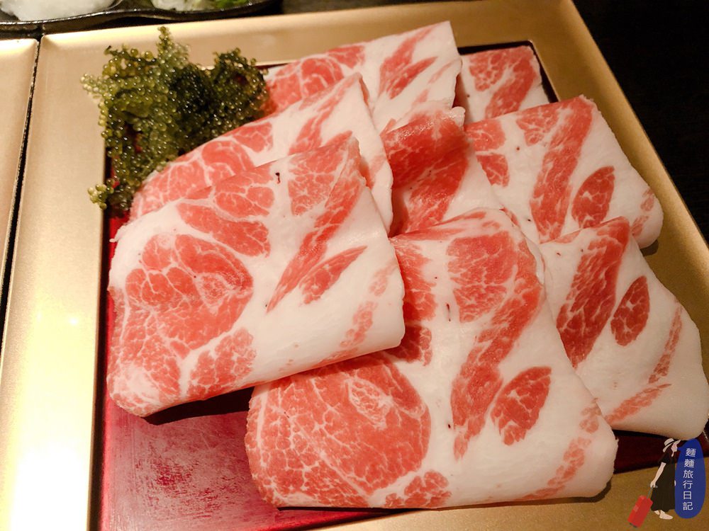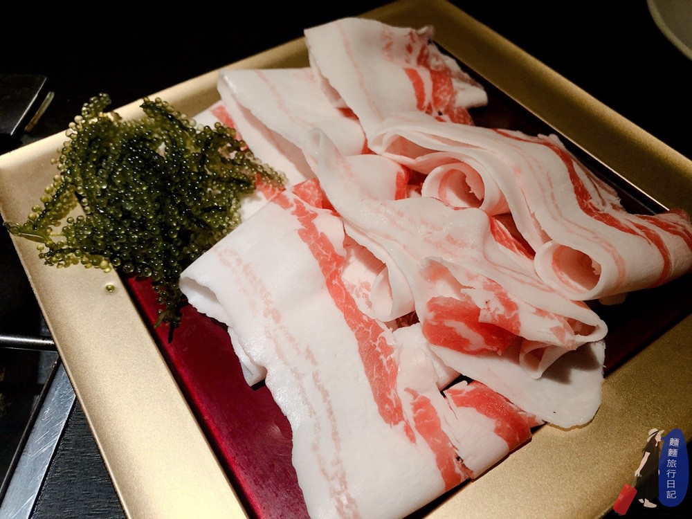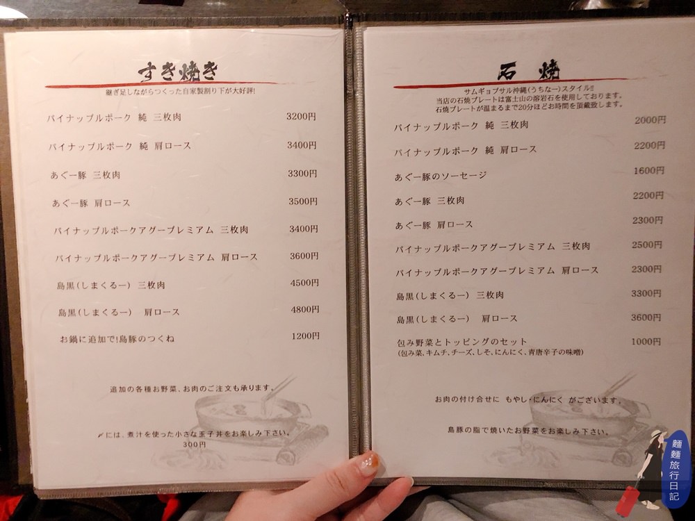 這間店主要有三種豬肉,菜單左邊有肉的品質介紹,分別是パイナシプルポーク鳳梨阿豬肉、あぐー豚是混種白毛黑斑點阿古豬跟島黑しまくろー是Shimakuro這三種豬肉,島黑是沖繩有75%以上本土阿古豬血統的豬肉,最珍貴好吃啊;然後也有三種吃法可以選,右邊是水晶火鍋!