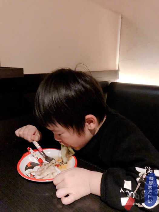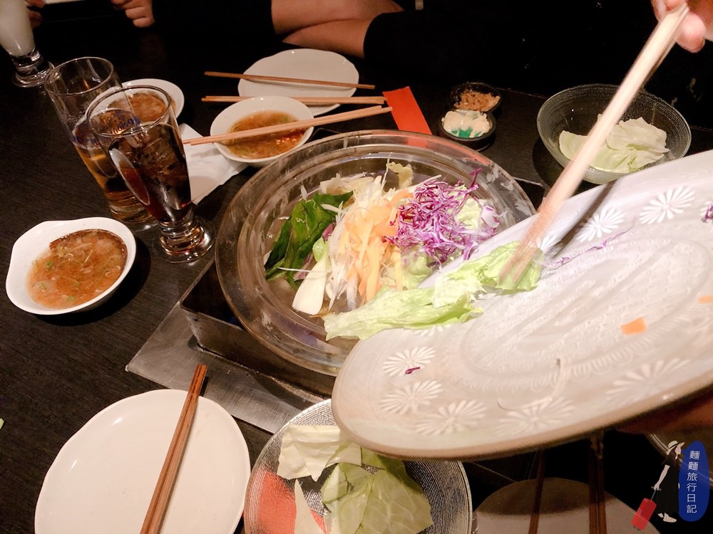 我偷偷觀察其他桌也點唰唰鍋的日本人,發現他們會把唰好的豬肉片放在盤子上,夾一些鍋裡的蔬菜放在肉上面,包起來吃!這時我才恍然大悟,原來把菜切的細細的是要包進肉裡啊!很聰明欸!同時可以吃到好吃的豬肉、也不忘了補充各種蔬菜。