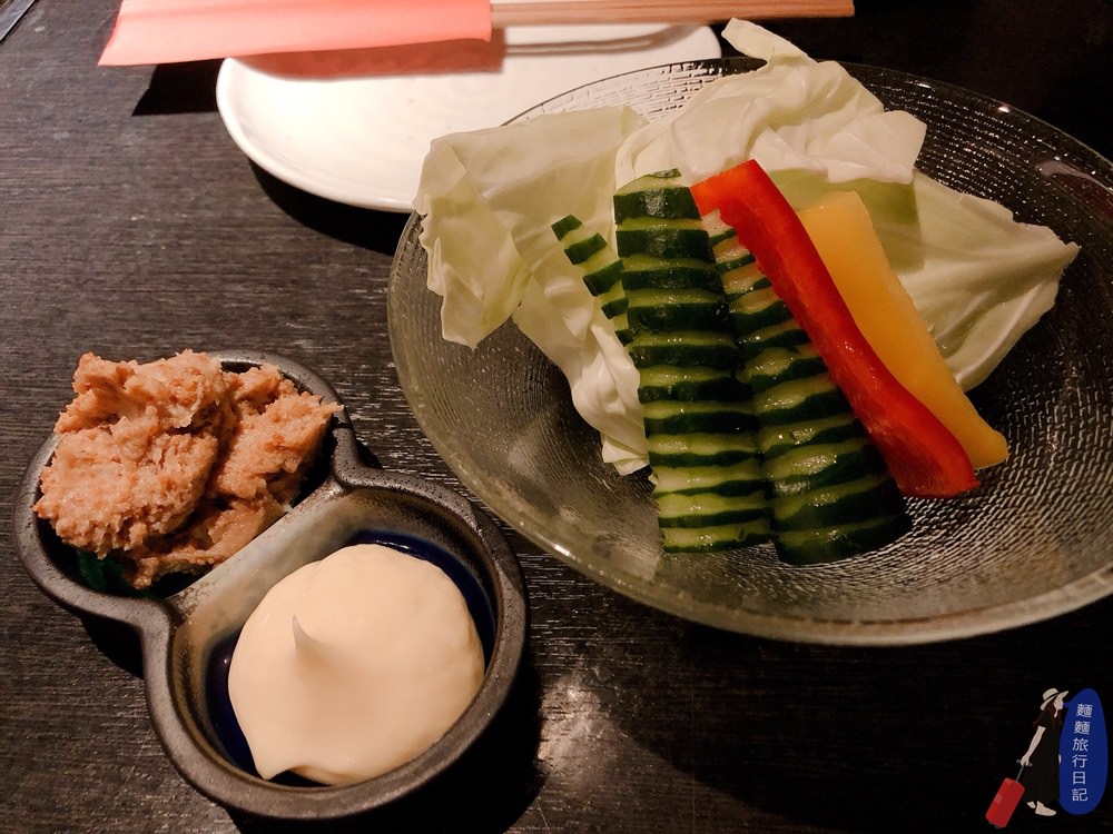 這就是真的沙拉了,旁邊附的是吃生菜沙拉沾的醬料,白色的那個很像美乃滋、比較特別的是旁邊那個是味噌肉醬,把味噌肉醬包在高麗菜裡面,真的非常好吃!美味爽口!