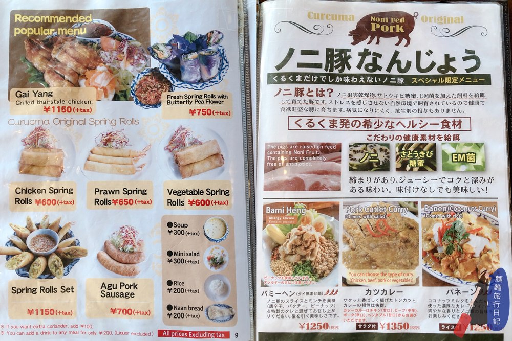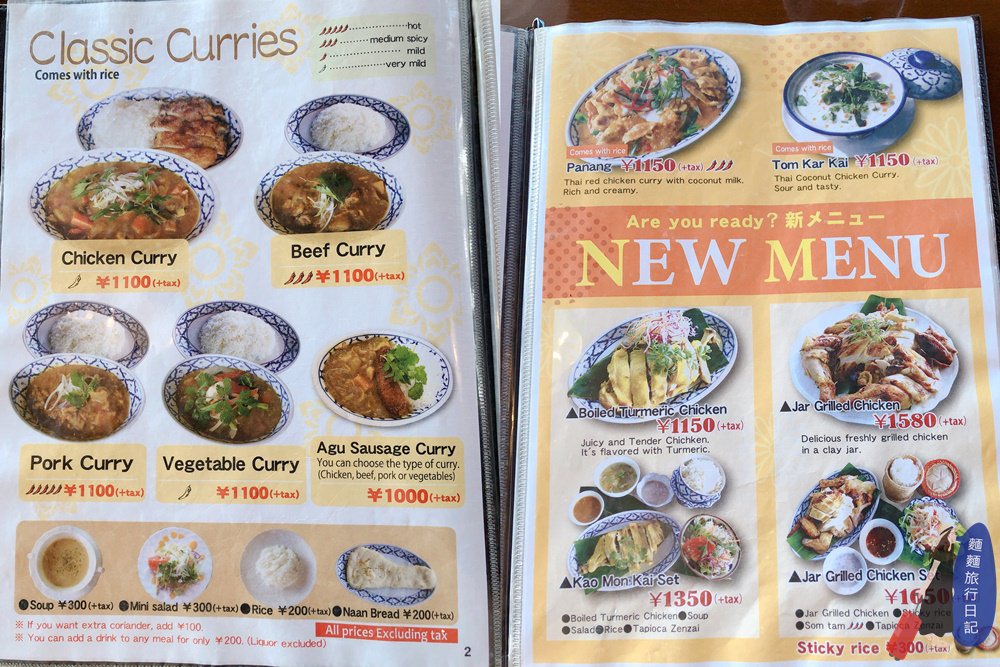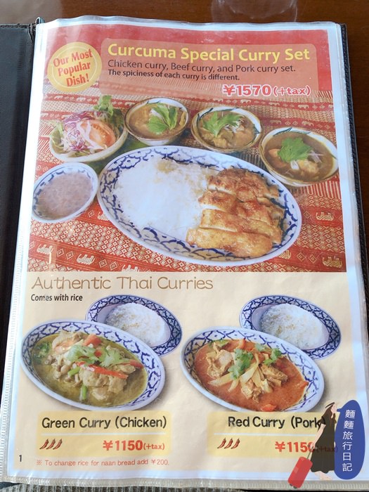 進餐廳後,服務生會送上菜單,翻開第一頁就是本店的招牌套餐薑黃花咖哩套餐,下面還有綠咖哩跟紅咖哩。