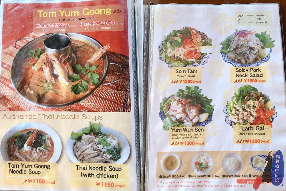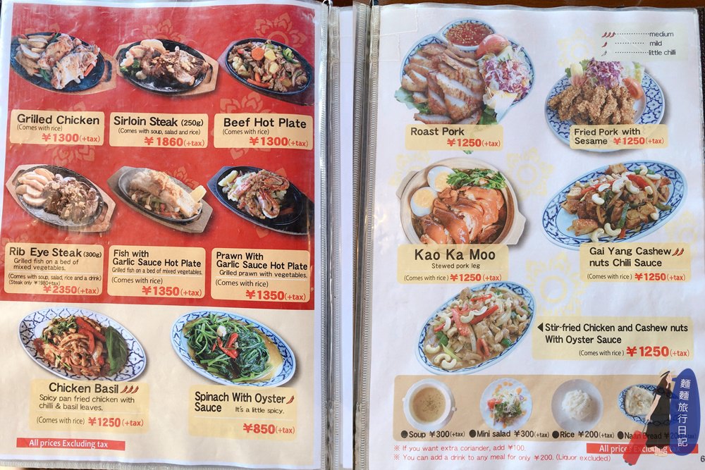 這頁菜單有點有趣,左邊是居然是鐵板料理🤣🤣🤣,泰國料理怎麼會出現鐵板啦是邪教嗎,我完全沒點;右邊有一些菜可以單點,烤豬肉、豬腳等,主菜都可以加下方的差價變成套餐,可以加湯、沙拉、白飯,不喜歡吃飯可以變成餅。