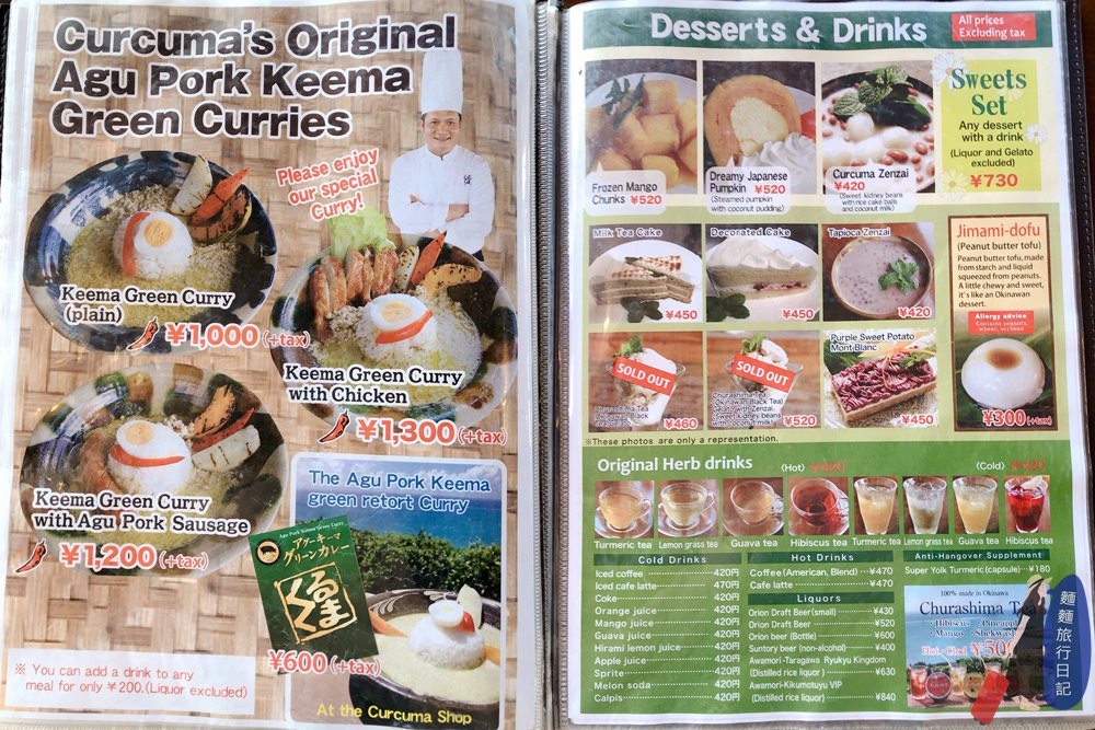 左邊是沖繩特產阿古豬綠咖哩系列;右邊是甜點飲料。