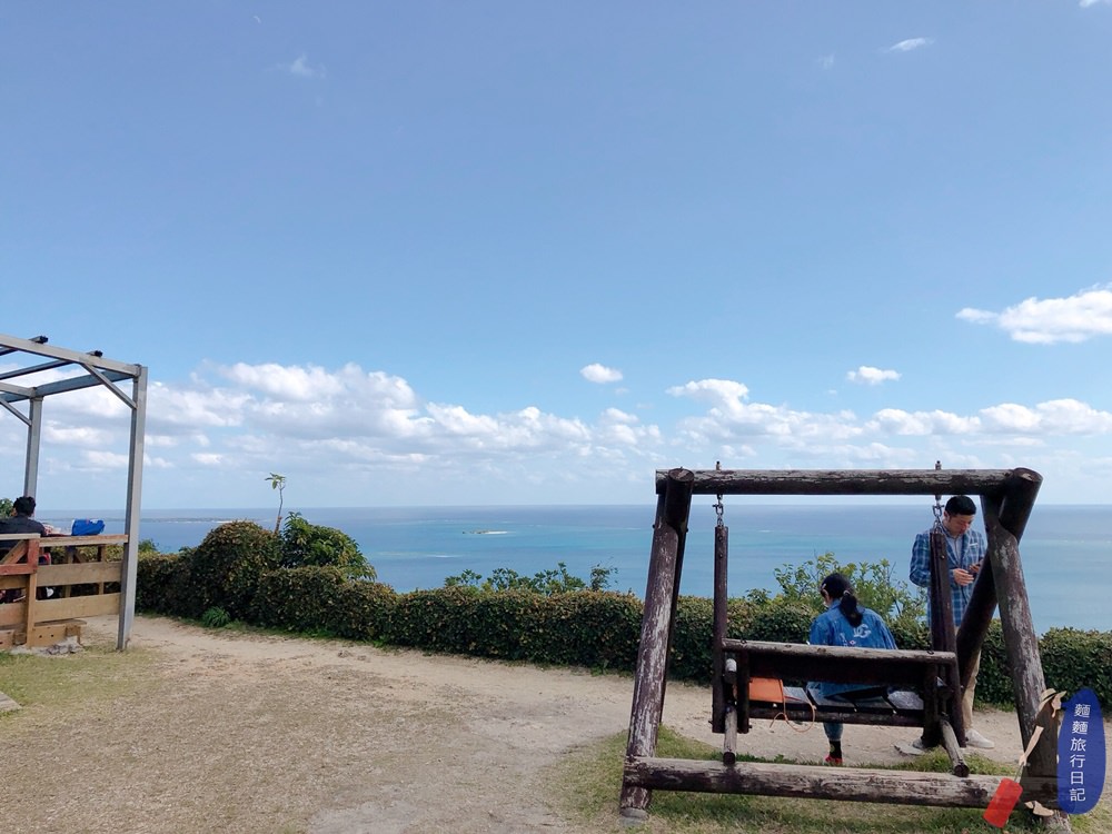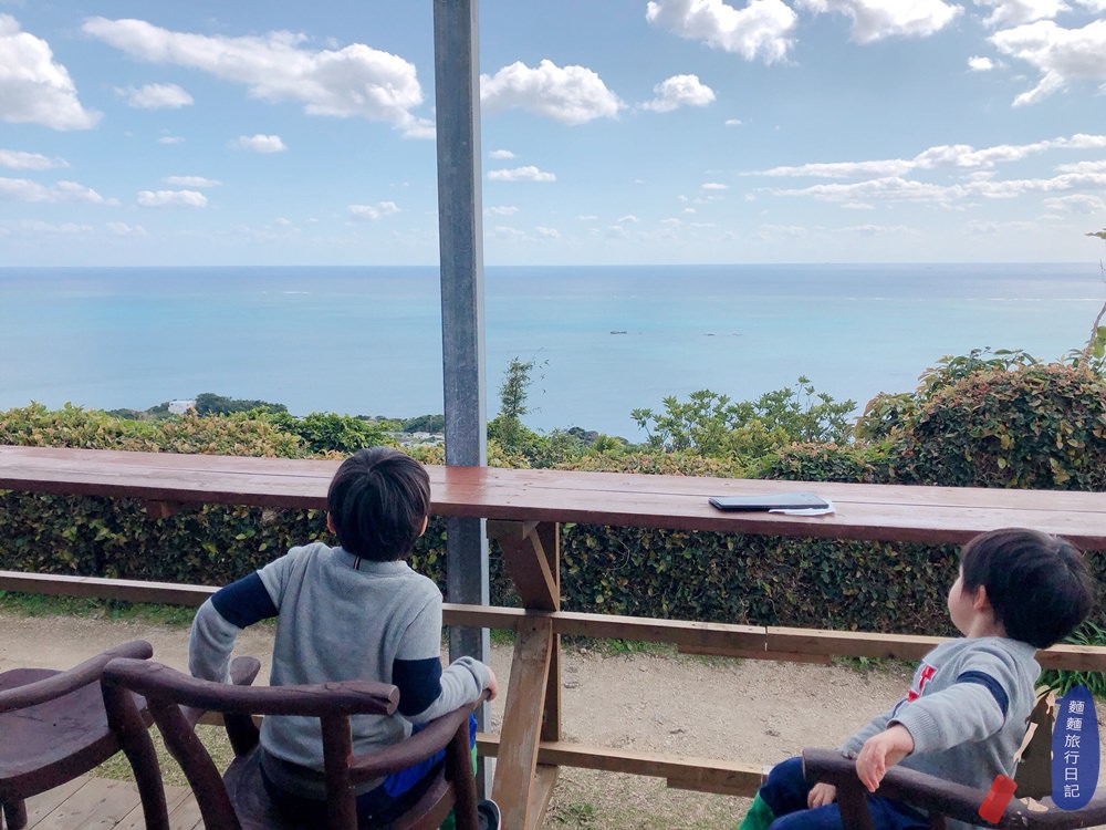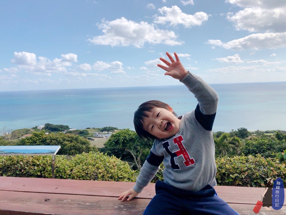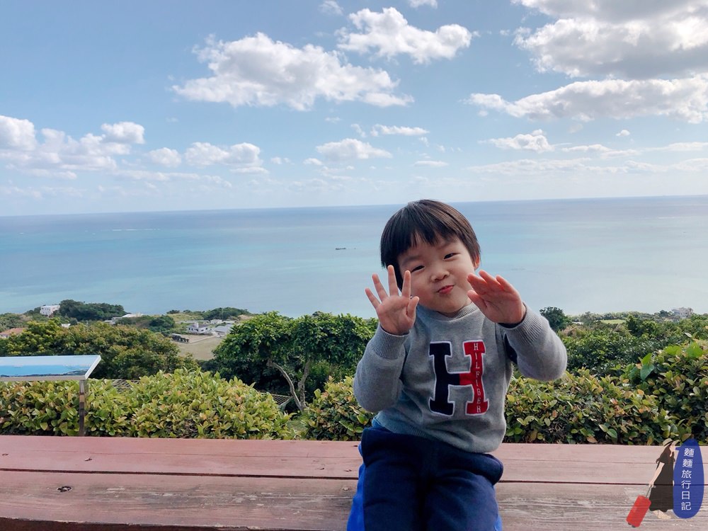 波仔應該看的到海,但是樂樂….可能會被前方的樹叢擋住😂😂😂,所以各種喬位置,各位村民朋友廣角太平洋就在你眼前,有看到漸層的藍色沖繩海嗎!!!加上藍色天空,夢幻到不行!