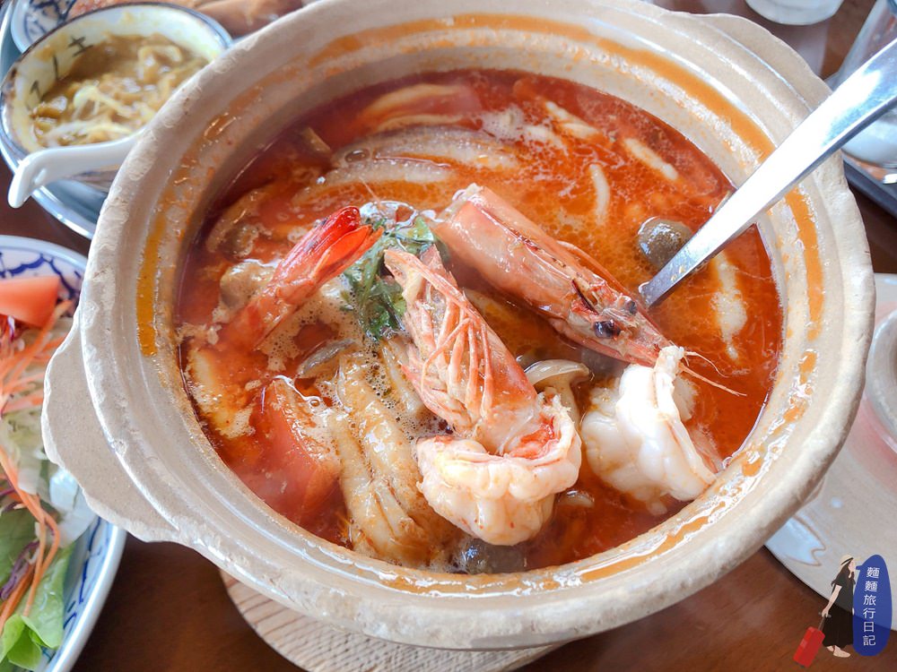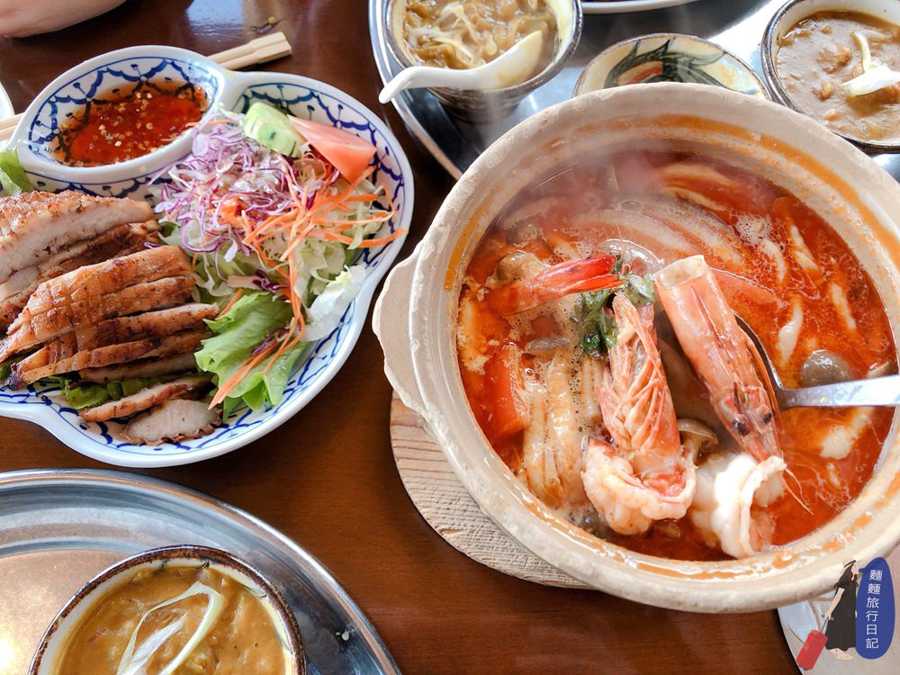 南洋料理當然不能少了我最愛的冬蔭功湯,左邊是泰式酸辣海鮮湯跟泰國河粉湯麵;左邊是泰式沙拉,涼拌木瓜絲啊豬頸肉沙拉啊海鮮沙拉啊雞肉絲沙拉啊。