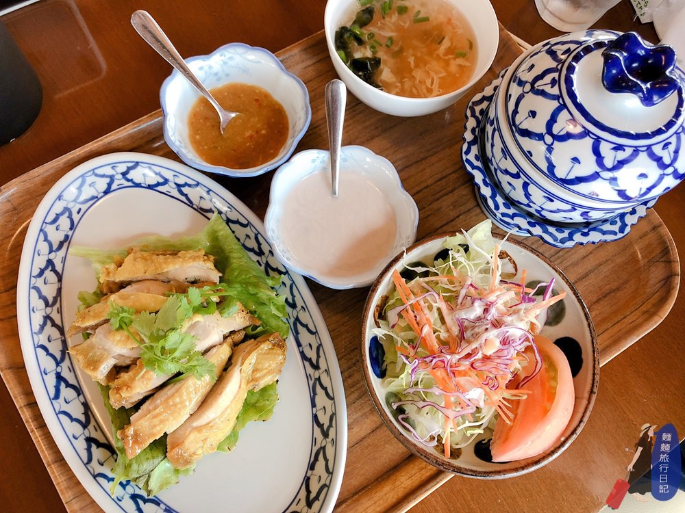 我們還點了海南雞飯套餐,套餐裡面有主餐海南雞、一份小份的沙拉、白飯、湯、甜點,海南雞旁邊有醬料,可以直接淋在雞肉上。