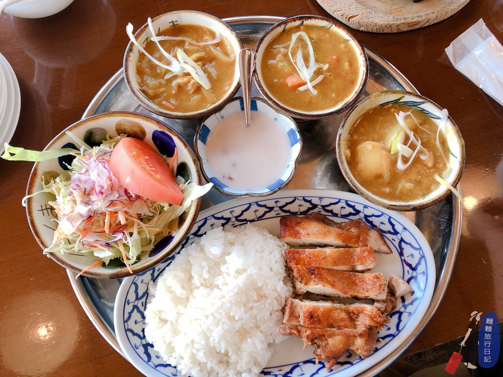 我點了招牌薑黃花咖哩套餐,裡面總共有三種咖哩:雞肉不辣咖哩、牛肉中辣咖哩、豬肉激辣咖哩,點招牌套餐能一次品嘗三種不同風味的咖哩,很超值!Cafe薑黃花的招牌咖哩套餐可是榮獲泰國政府認證過日本第一名泰式咖哩,除了咖哩白飯旁邊的炸雞腿也美賣,外面炸得金黃酥脆,裡面雞肉不柴。