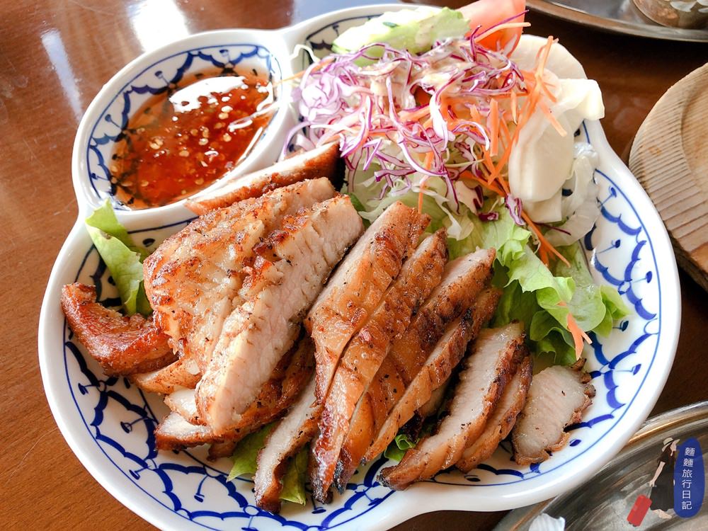 單點烤豬肉,豬肉外面烤的香香脆脆,一口咬下裡面卻是軟嫩好吃的,豬肉很Q彈,搭配泰式酸酸甜甜的醬汁,很好吃~ 村長很愛泰式旁邊都會放一些生菜,肉吃再多都不怕油膩,搭配著生菜一起吃很清爽。