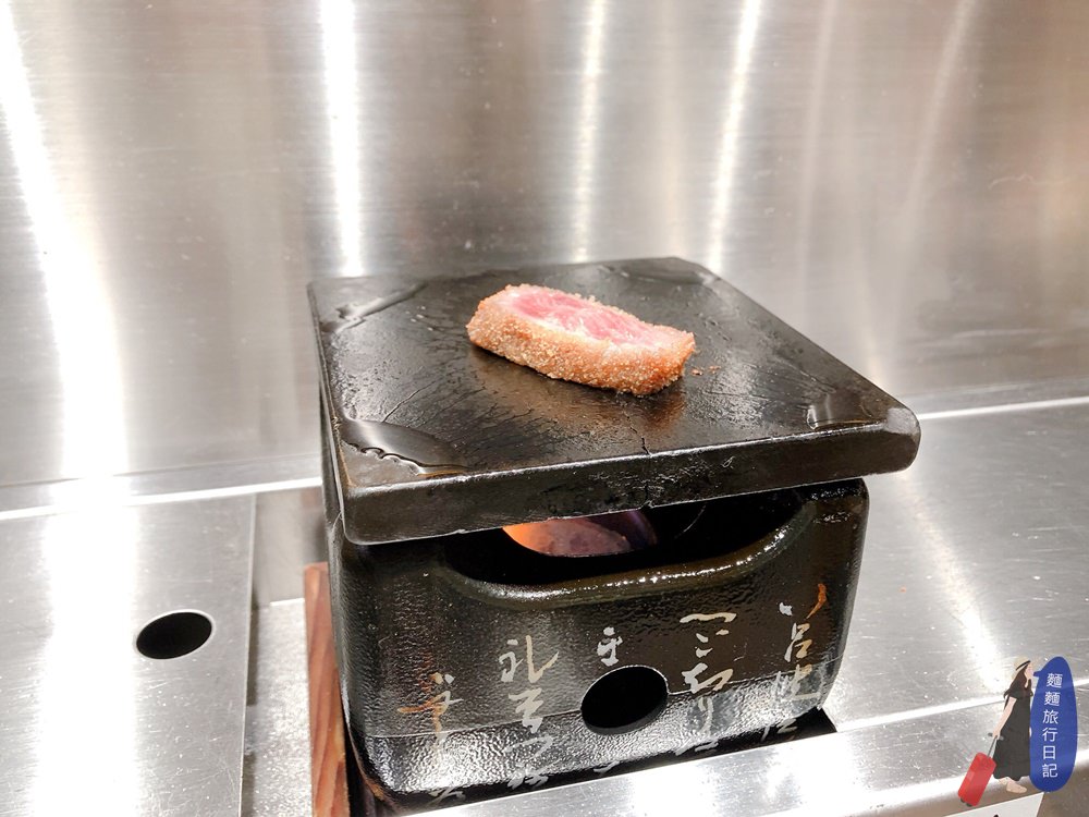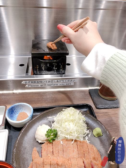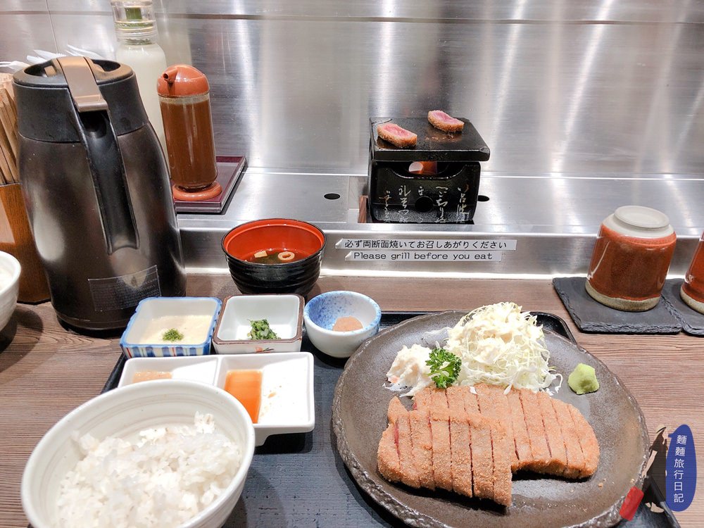 每個人的坐位前面都有一個小烤爐,點完餐後店員會直接幫你把烤爐點火喔!另外還會給你一張怎麼吃炸牛排的教學單,教你可以把牛排放到烤排上加熱烤熟,桌上左邊那壺是麥茶,日本餐廳炸物餐點通常都會送上麥茶,讓你在吃炸物時搭配,滿解膩的,另外桌上還會放醬料喔~~~因為每份套餐裡都有附高麗菜絲,所以有胡麻沙拉醬跟柳橙醬可以淋在高麗菜絲上,除了套餐裡附的炸牛排沾醬外,桌上還有岩鹽可以使用。