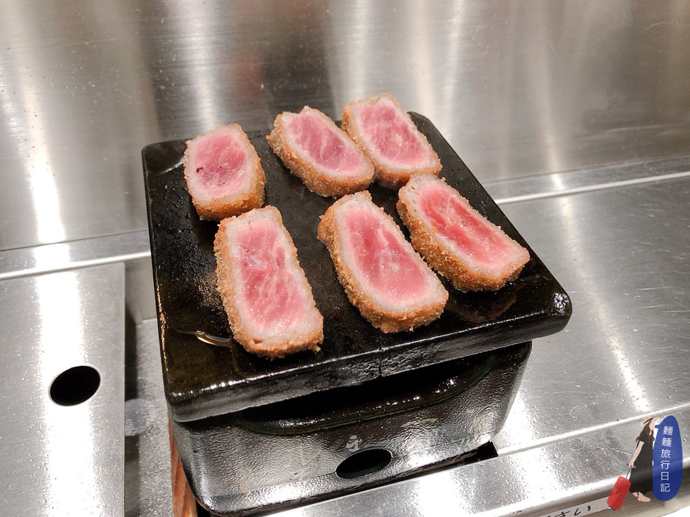 烤過後的炸牛排油脂釋出到石板上,光看照片就可以聽到牛排接觸到熱鐵板發出滋滋作響的美味聲音,烤好的炸牛排總共有四種沾醬可以沾著吃,兩種是套餐裡面附的醬油跟胡麻醬,另外桌上還有岩鹽可以沾著吃、最後一種是哇沙米芥末加到醬油裡沾著吃,每一種醬料味道都不一樣,村長加量炸牛排就不怕單調,很多種沾醬的味道可以選擇,炸牛排外層炸得很酥,咬下去還可以聽到卡滋聲,沒想到裡面居然如此軟嫩、入口即化,好吃到我都不相信他是牛排了,超愛炸牛排,村長都吃第二次了,絕對好吃!